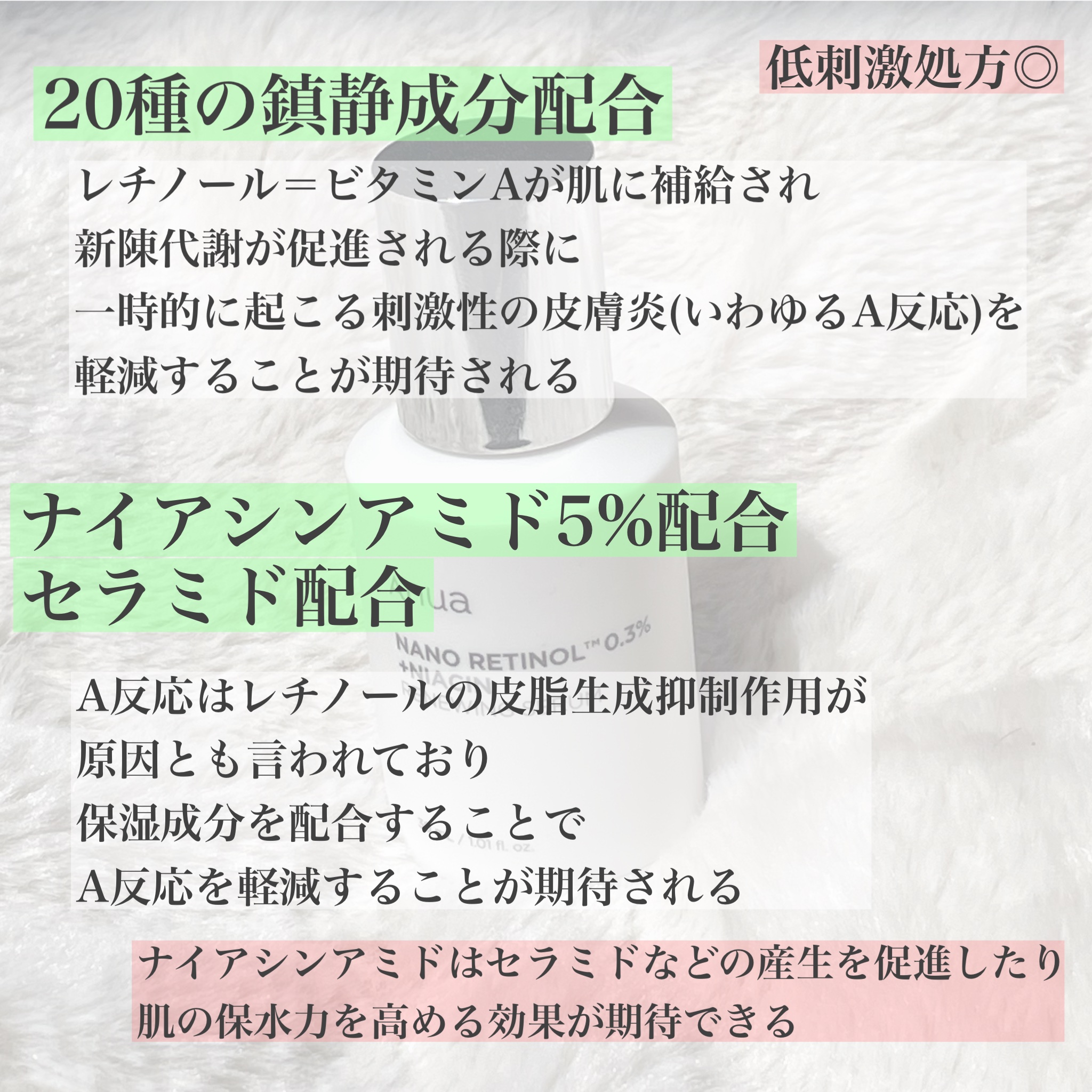 敏感肌の私もレチノールを使いたい! ANUAのレチノールを選択‼️ 鎮静成分や保湿成分を配合しとるせいか A反応は起きんかったし 肌のザラつきが気にならんくなってきた🥴