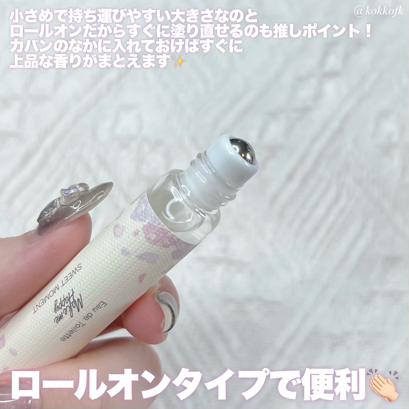 - つける量を調整しやすいロールオンタイプのオードトワレ。 持ち運びにも便利なサイズです。 サトウキビ由来の植物性アルコールを使用。 SWEET MOMENT:多幸感溢れるフローラルブーケの香り TOP:オレンジ、アプリコット、レモン、ベルガモット MIDDLE:ピオニー、ローズ、ピーチブロッサム LAST:パチュリ、ムスク、バニラ