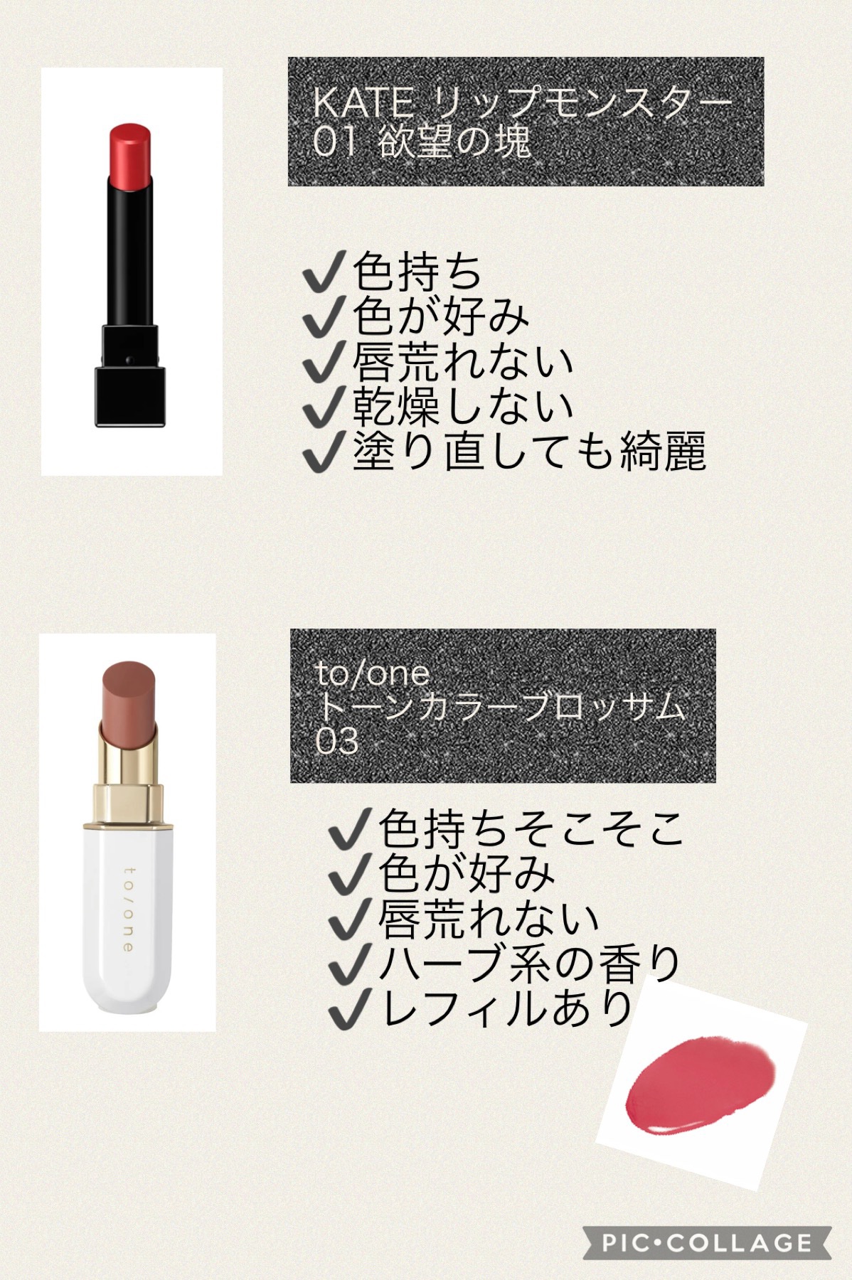 リップモンスター大好きです💕 色持ちもよくて荒れない…最高です😭 後述しますが、私は荒れやすく乾燥もしやすいので、色持ちがよくても乾燥してひびが入って汚くなってしまうことが多々あります😓 好みの色ドンピシャでした💕 色持ちがいいと言われるリップよりは残りませんが、そこそこ持つと思います! 香りもいい香りで落ち着きます😌 ハーブ系で私はこの香りは大丈夫でした! 乾燥していると唇に馴染まないので、リップクリームを塗ってから塗るといいと思います🎵 これを朝さっとひと塗りするだけで、帰宅後まで比較的残ってます! 個人的には、ティシュオフした方が色残りがいちように感じるため、メイクの合間に塗って擦り合わせずに時間を置いてからティシュオフしています ただ、相性が悪いときは唇がめちゃくちゃ乾燥したり、皮がめくれてしまいます😓