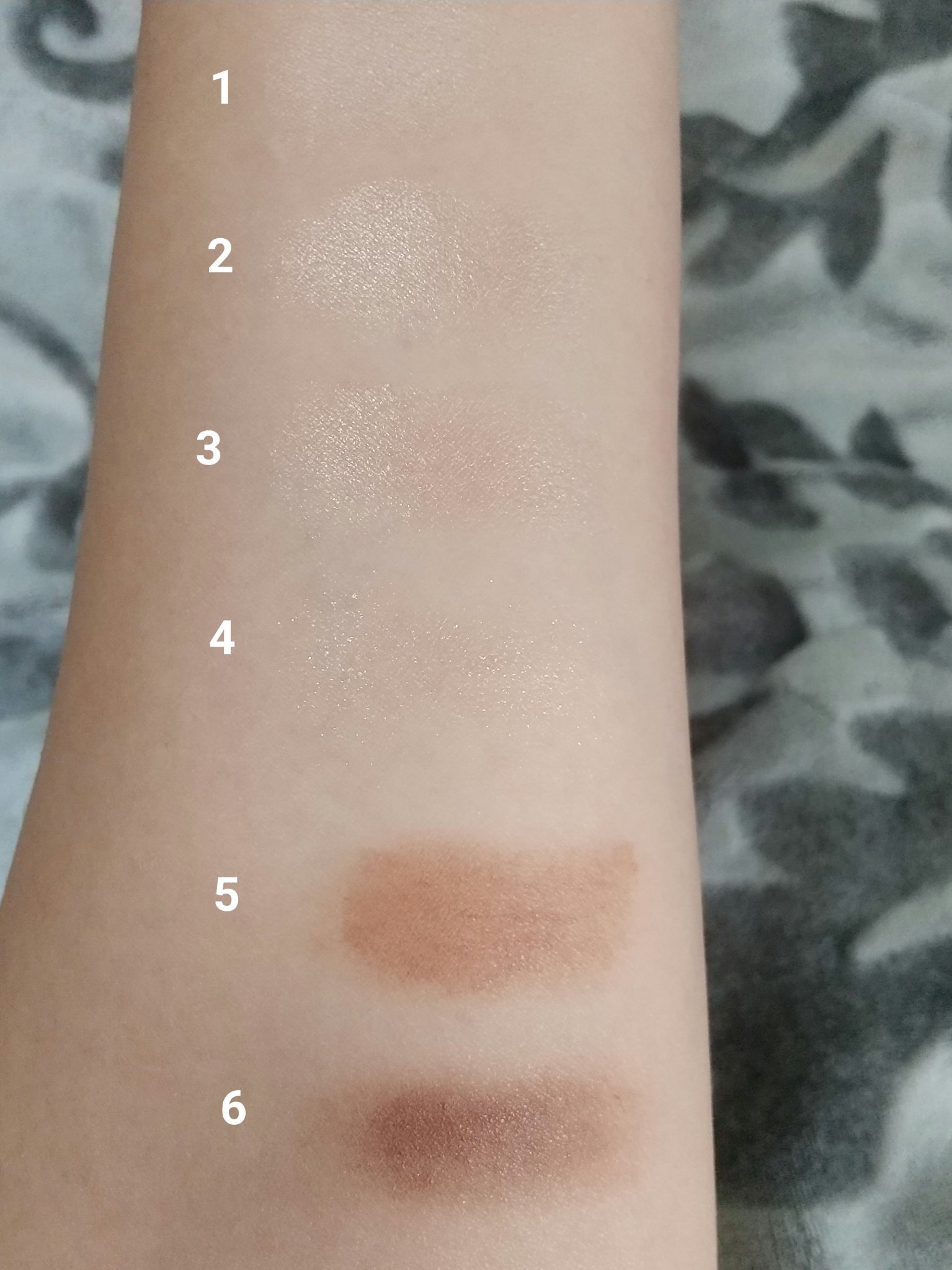 左上、左下、真ん中上、真ん中下、右上、右下という順番でスウォッチしてみました。 出してみると商品の写真より肌にのせたほうがくすみが出るかな✨という印象です😌 伸ばしやすくて指でも筆でもつけやすいです☺️💕 とっても可愛いカラーなのでオススメです💠