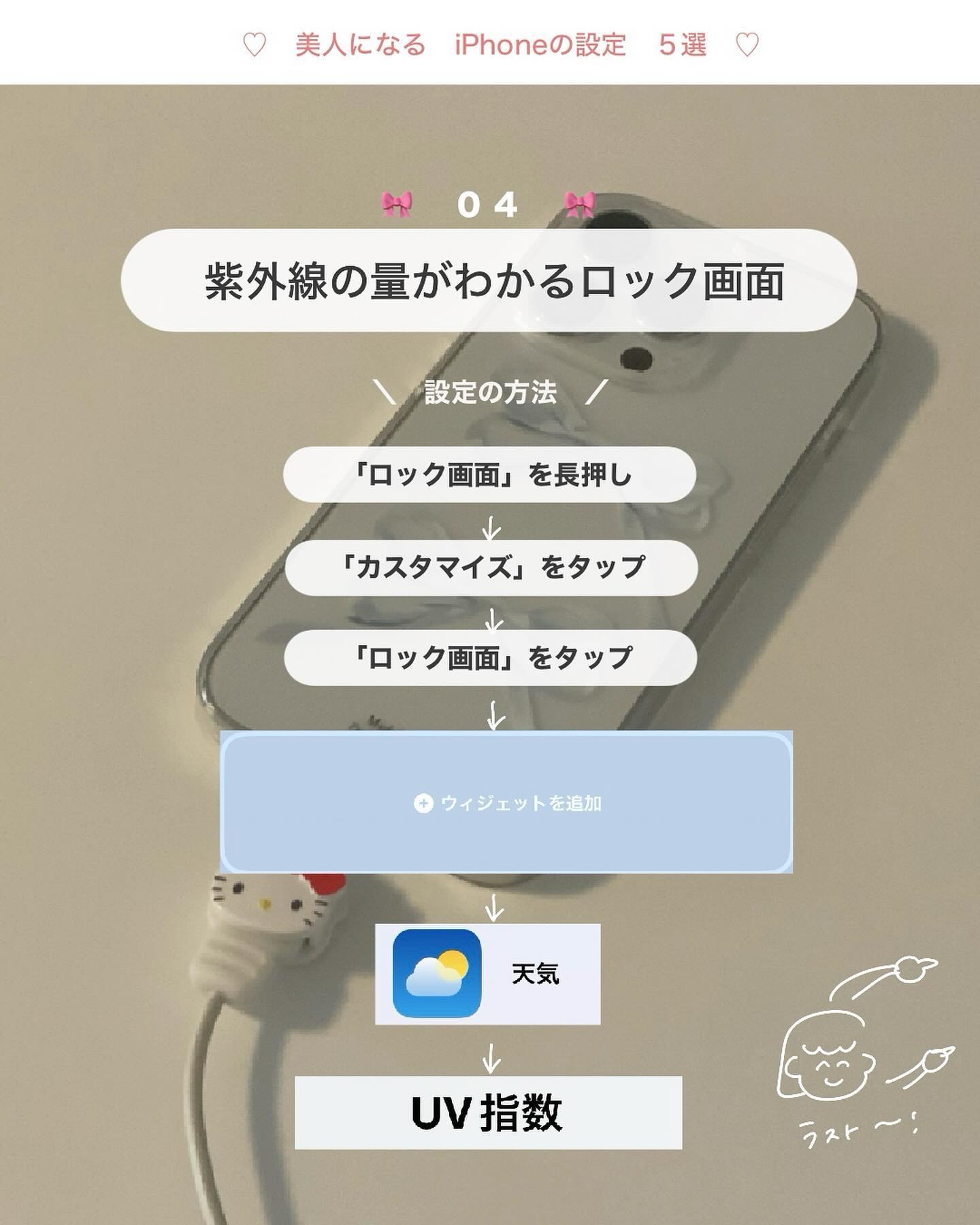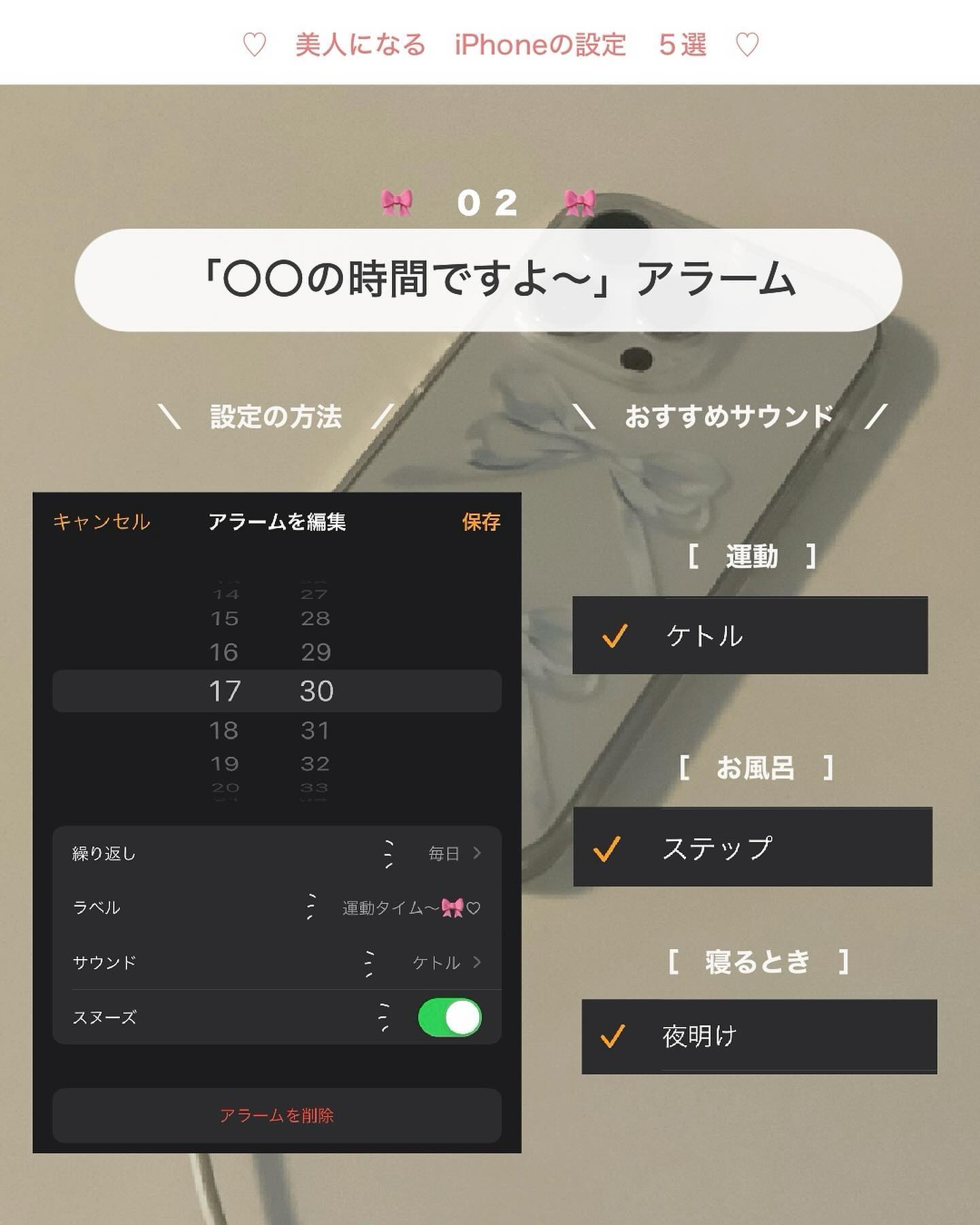 01[スマホの距離が近い時教えてくれる設定] 1.設定アプリを開く 2.「スクリーンタイム」をタップ 3.「画面との距離」をオンにする02[〇〇の時間ですよ〜アラーム] 1.繰り返し→毎日 2.ラベル→(お好みで♡) 3.サウンド→(お好みで...