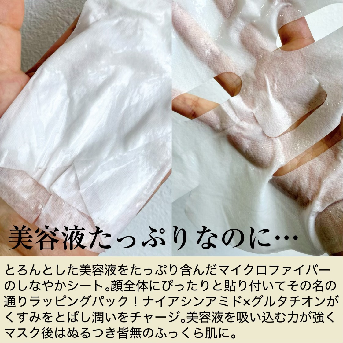 - ナイアシンアミド※1×グルタチオン※1 #くすみ※2ケア #うるおいケア #マイクロファイバー 乾燥によってくすんだ肌をやさしくケアして、なめらかでうるおいのある肌へ。 ナイアシンアミド※1、グルタチオン※1のシナジー効果で肌のくすみ※2を改善し、キメを整え、なめらかな肌へと導きます。 マイクロファイバーシートが肌を包み込むように密着します。 ※1 配合目的:整肌 ※2 乾燥による