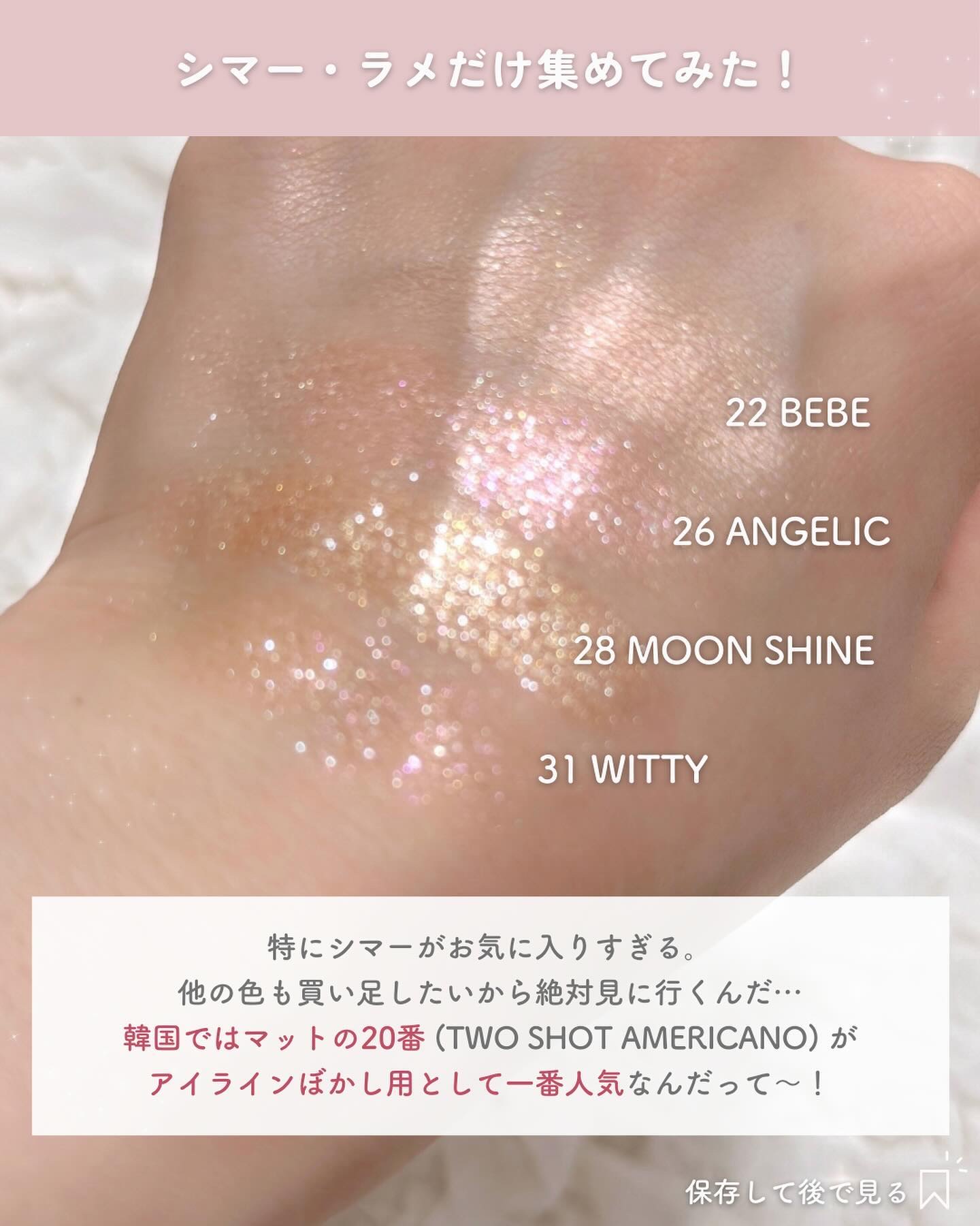 - さらさらほどける質感のアイシャドウ。 使いやすい絶妙なカラーバリエーションのシングルアイシャドウ。 【日本発売色6色】 <02ピンキッド> 自分の好みでパズルのように組み合わせて使えるアイシャドウ。乙女心をくすぐるかわいらしく優しいピンクカラー。 <20ツーショットアメリカーノ> 自分の好みでパズルのように組み合わせて使えるアイシャドウ。ライナーのように活用できるディープブラウン。 <22ベベ> 自分の好みでパズルのように組み合わせて使えるアイシャドウ。涙袋ハイライターにオススメなピンキッシュベージュシマー。 <26エンジェリック> 自分の好みでパズルのように組み合わせて使えるアイシャドウ。クールピンクに紫色、レッドなどのラメがカラフルにきらめくグリッター。 <28ムーンシャイン> 自分の好みでパズルのように組み合わせて使えるアイシャドウ。ベージュにゴールド、シルバーラメがクラシックに輝くグリッター。 <31ウィッティ> 自分の好みでパズルのように組み合わせて使えるアイシャドウ。可憐なベージュにピンク、レッド、パープルのラメが上品に輝くグリッター。