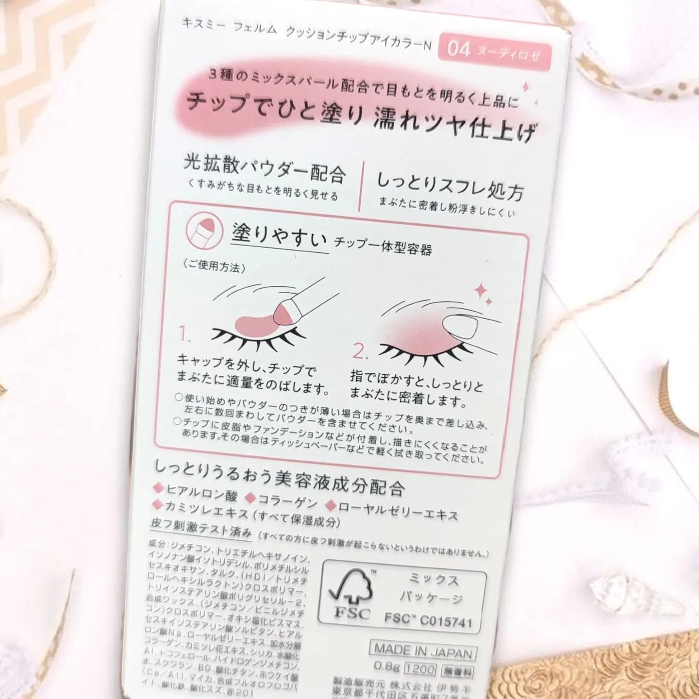 KissMeFERMEキスミーフェルムクッションチップアイカラーN◻︎3種のミックスパール配合で目もとを明るく上品に。◻︎そのまま塗れるチップ一体型容器。◻︎くすみがちな目もとを明るく見せる。 光拡散パウダー配合◻︎まぶたに密着し粉浮きしにく...