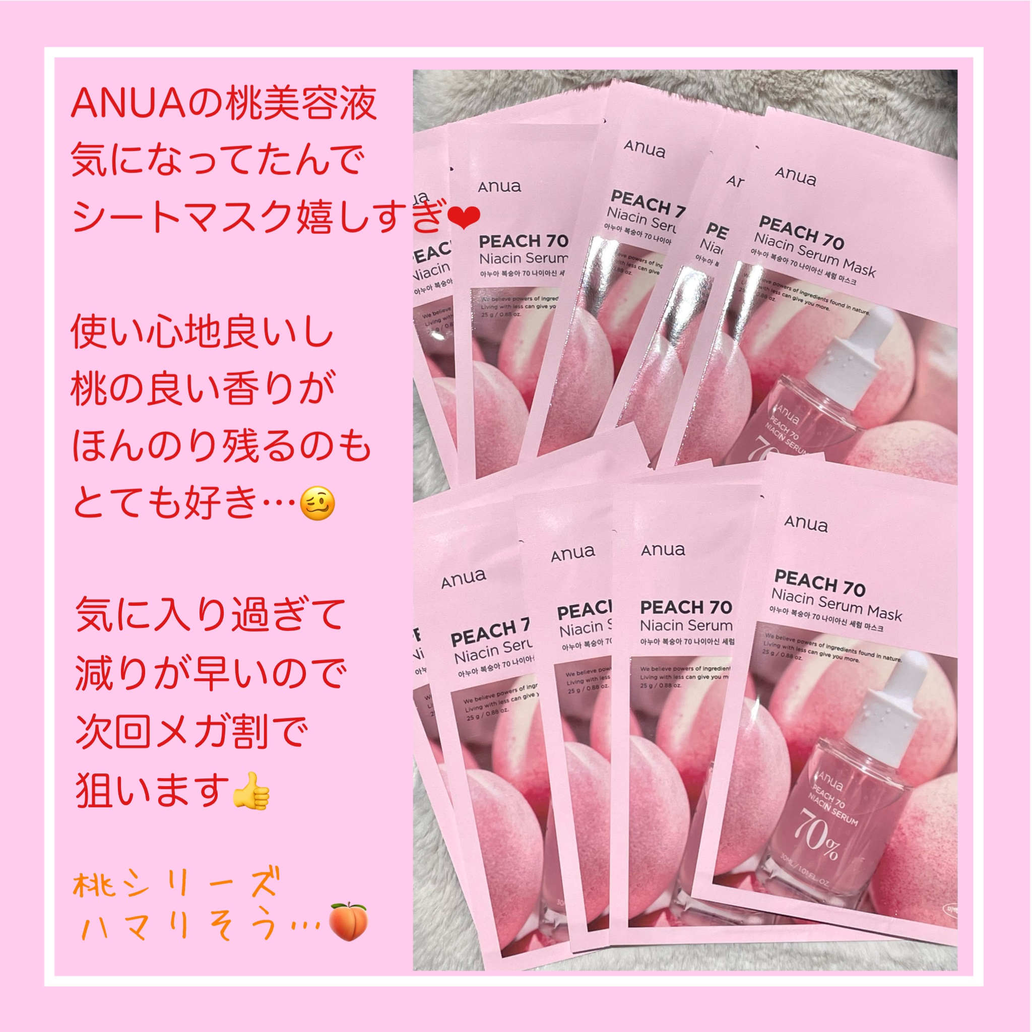 なんつっても桃の良い香りがたまらん🍑 桃美容液と同じ有効成分配合で ナイアシンアミドやヒアルロン酸などの 保湿成分がモリモリ✨ 袋の中には シートに含ませきれない程 ピンクの美容液がたっぷり🥴 ANUAの桃シリーズは気になってたんやけど 思いがけずシートマスクが試せて めっちゃ嬉しい🥴