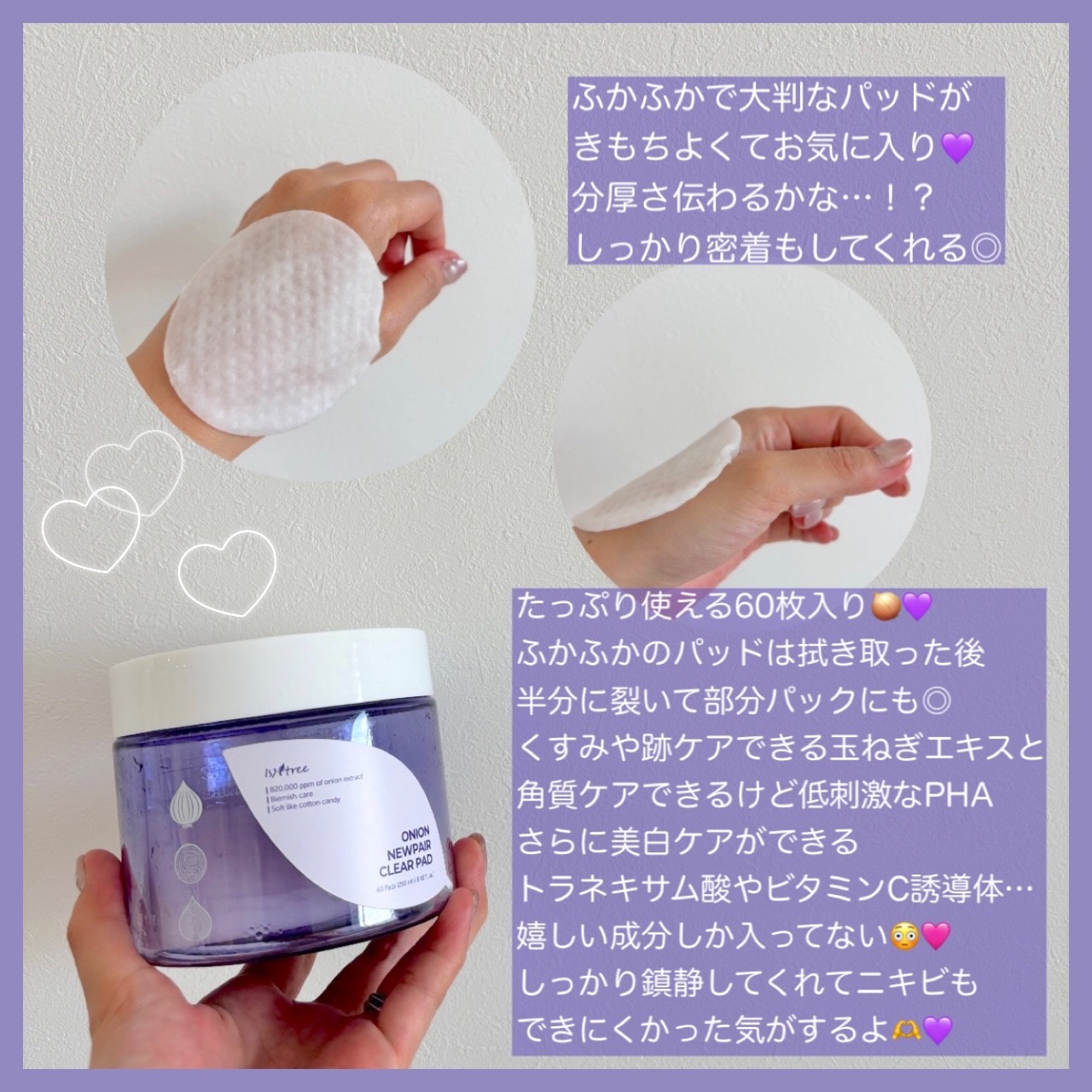 isntreeさまからいただきました。isntreeオニオンニューペアクリアパッド✂🟣韓国の務安産、紫玉ねぎエキス82%▶︎敏感になった肌を鎮静。肌のくすみや跡をケア。🟡ナイアシンアミド🟡トラネキサム酸🟡ビタミンC誘導体▶︎メラニン色素沈着に...