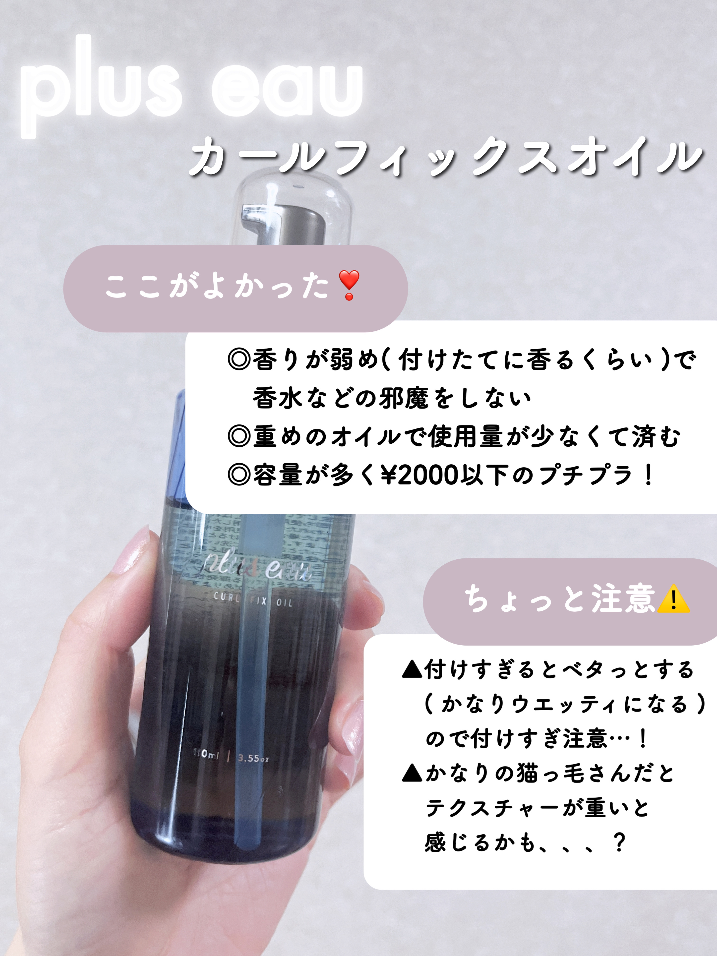 pluseauカールフィックスオイル¥1,650熱ダメージから守りながらカール出来る優れものです。アイロンの前に使用します。想像していたよりオイルを付けた時にけっこう濡れ感やツヤが出て「こんなに濡れた感じでクルクルカールが出来るのか?」と思い...