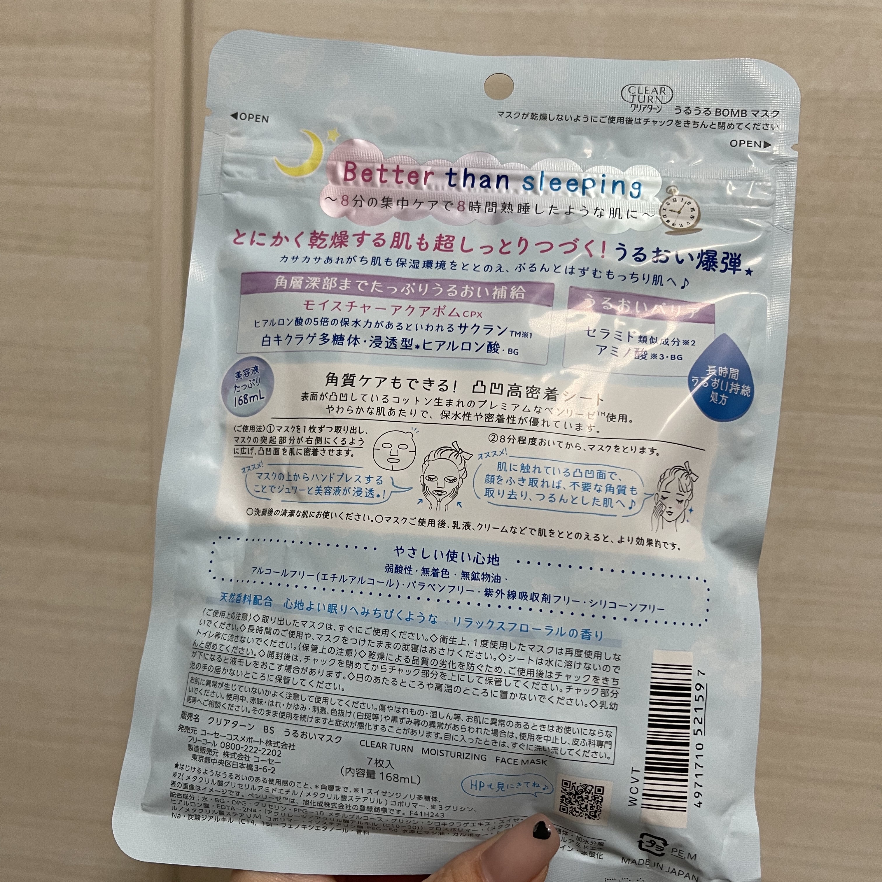 ♡クリアターンうるうるBOMB7枚入心地よい眠りへみちびくようなリラックスフローラルの香り。oOo。.:♥:.。oOo。.:♥:.。oOo。.:♥うるうるBOMB初めて使用してみました!香りもよくパックも広げやすく付けやすい☺️8分程度おくだ...
