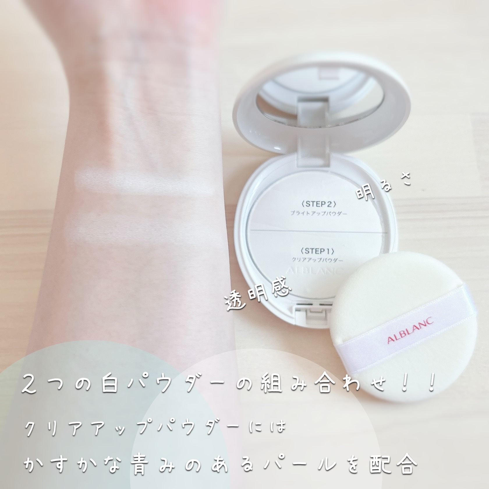クリアアップパウダー:くすみをカバーし、顔全体の透明感をアップさせ、肌をなめらかに見せる。 肌なじみがよい“ピンクニュアンスパール”配合・時間が経っても、メイクがくずれにくい。 隠ぺいしすぎず、素肌の透明感を活かして仕上げる“半透明バランス設計”・毛穴の影を明るく見せ、色ムラ・くすみをぼかす“花びら状パウダー”