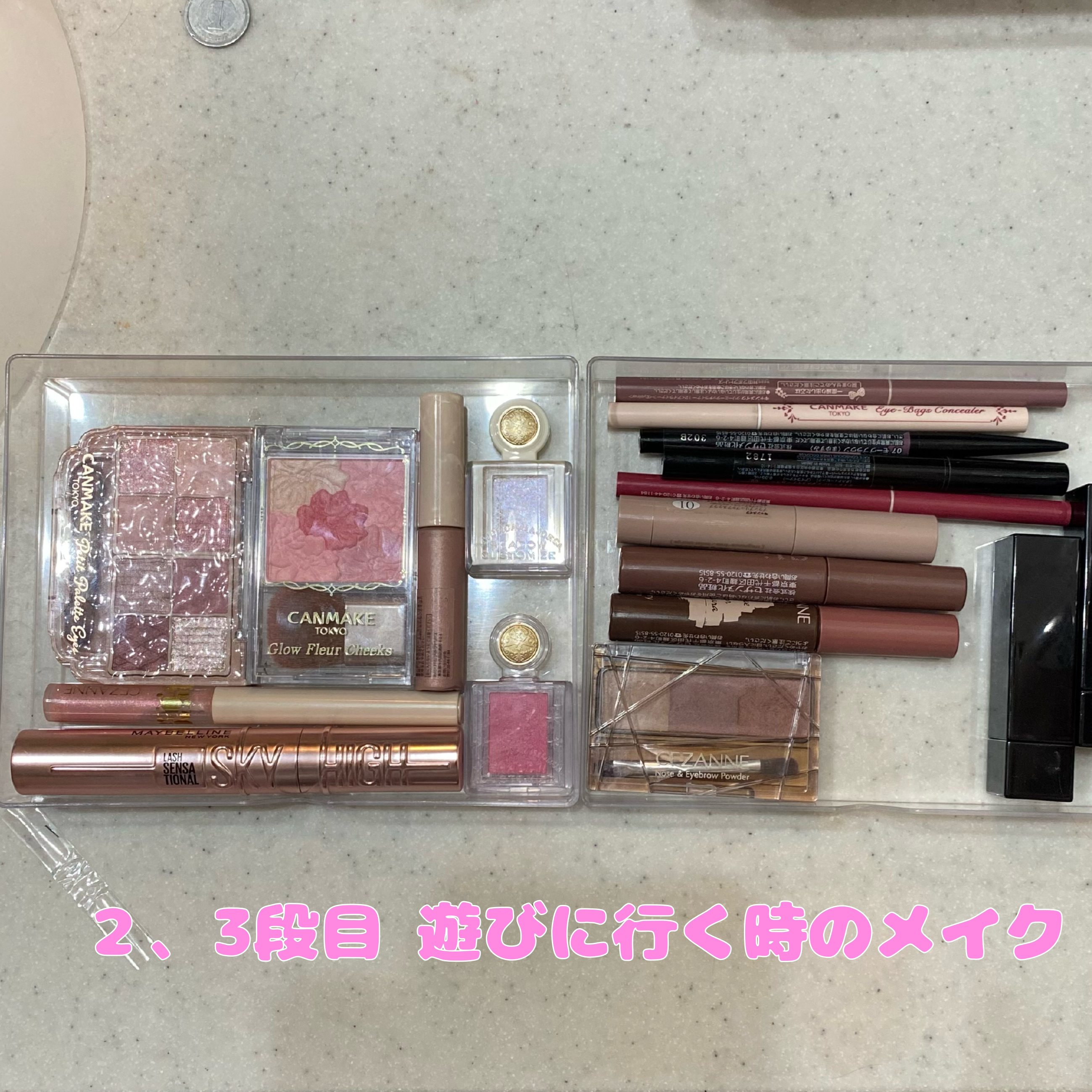 使うシーンごとにまとめています! いちばん取り出しやすい1段目の引き出しには、バイトや大学に行くためのデイリーメイクに使うもの達 そして、棚の手前に置いてあるトレイには、ファンデーションやハイライト、シェーディングなどのベースメイクで使っているものを置いています。
