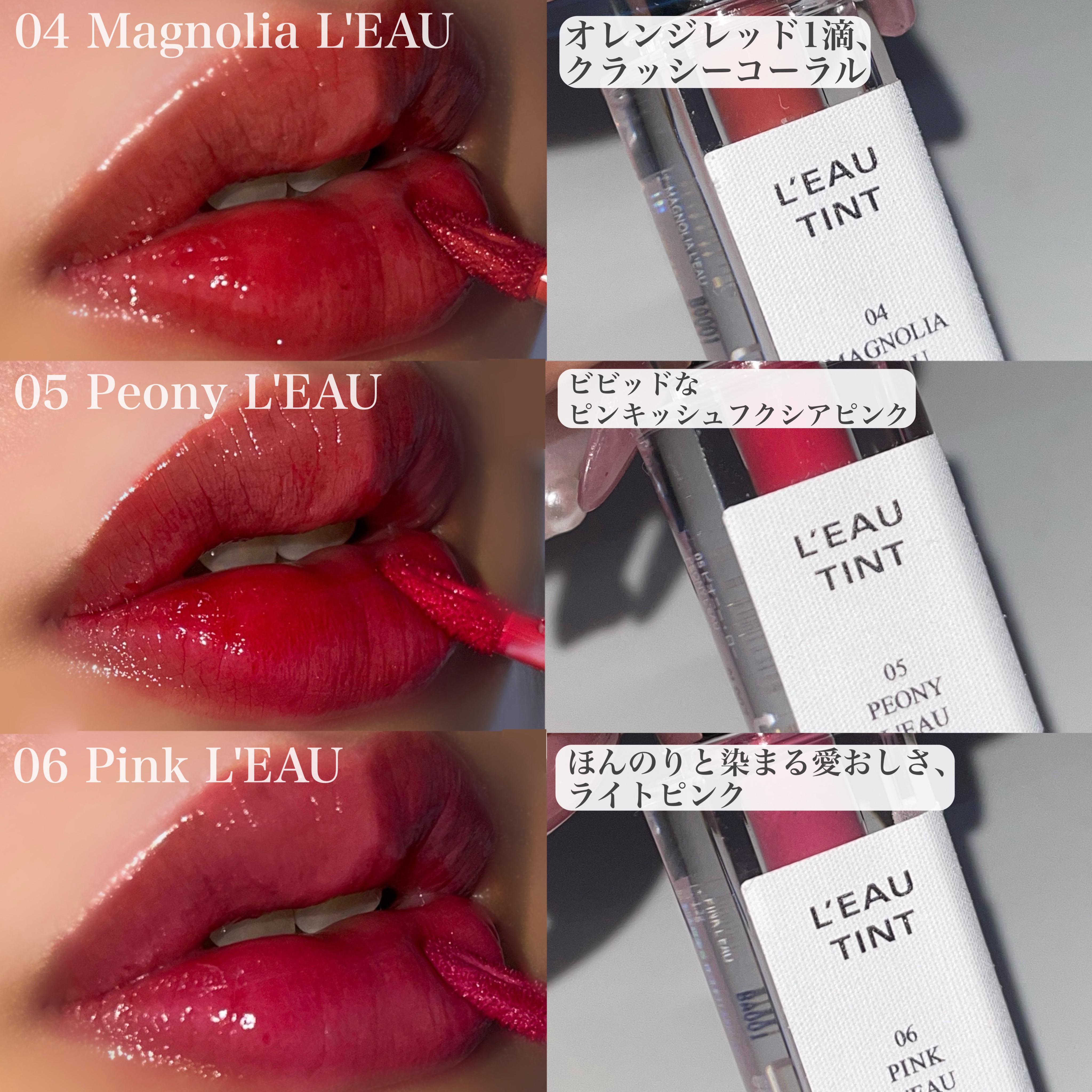 - - うるおいリップなのにしっかりカラーが定着し、時間が経っても塗りたてそのままのカラーを維持 *色が落ちにくいことから「飲み会リップ」としてSNSで話題に - 水のように軽くて快適なグロウティント、塗り重ねるほど鮮やかで透明に浮き上がる水彩画カラー - 香水瓶をイメージしたBBIA初のカスタムデザイン。パッケージはもちろん、カラーとテクスチャーに真心を込めて開発