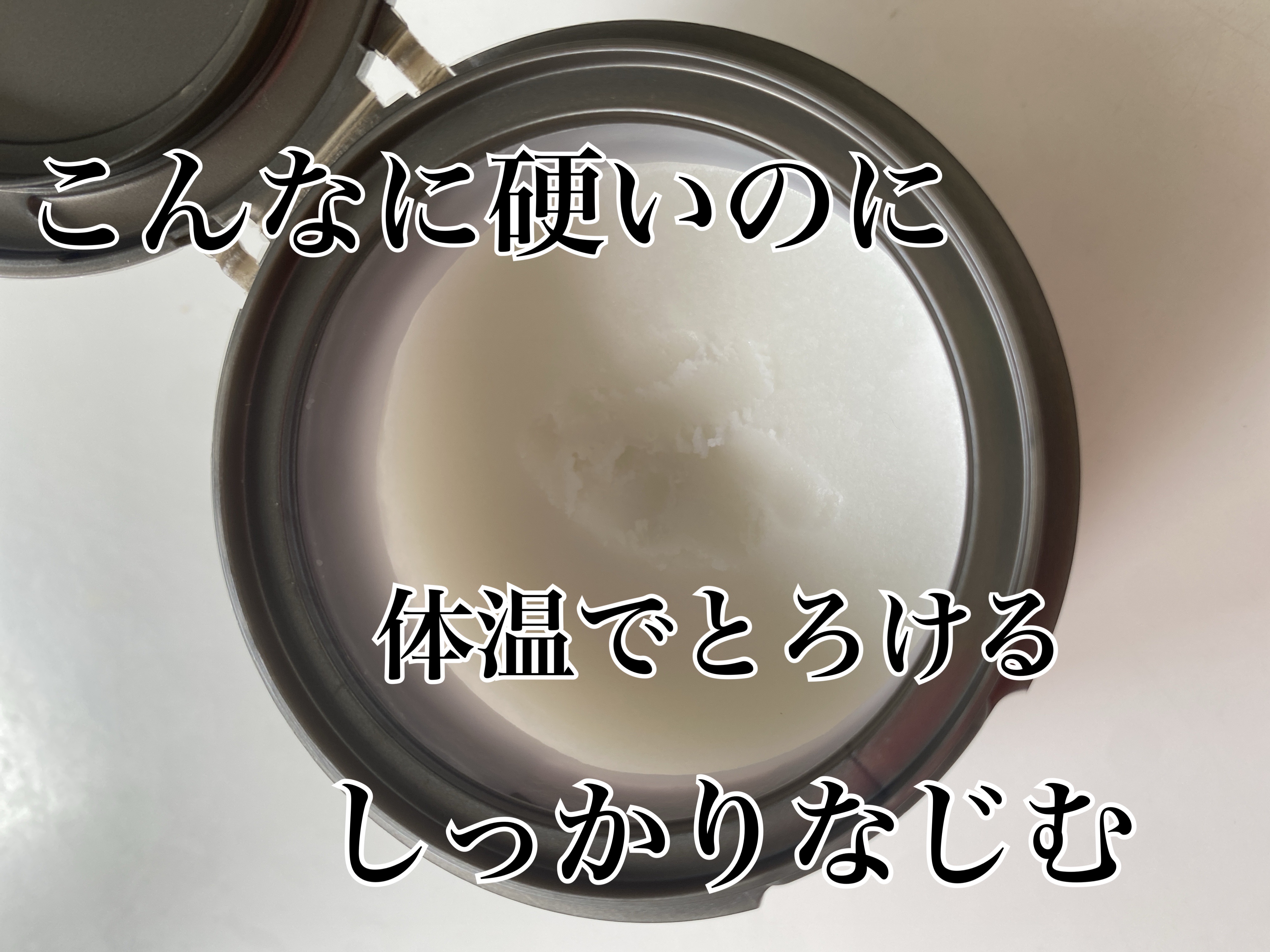 とろけやすく ヘアリートメントバームとしても使える新感覚✨ 指で取ると柔らかさあり 手の温度で簡単にスーッと溶け ワックスとオイルの間のようなテクスチャーに変わるの!! ベタ付きなく使え 艶っぽくシットリとし まとまりやすい髪に仕上がるの¨̮♡︎ ドライヤー前に使うと髪の乾燥を保護してくれのかな〜 潤いや艶が持続した感じがしたよ。