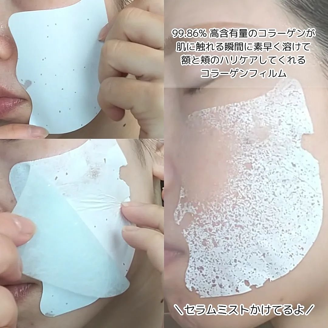 高栄養成分をたっぷり詰め込んだ高機能性ミストセラム✨ オイルミストではないのでベタつかない、トナーではないのですぐ蒸発してしまわないという潤いケアにぴったり😆👍🏻 ブラックスネイルが配合されているので、肌にしっかり栄養を与え、T3コラーゲンという、人が持つコラーゲンに近い成分が肌にハリや弾力を与えてくれるそうです🩷 ニュージーランド産のマリンコラーゲンとヒアルロン酸が配合。 フィルムを貼り付けることで、成分が肌に溶けて角層まで浸透するそうです!