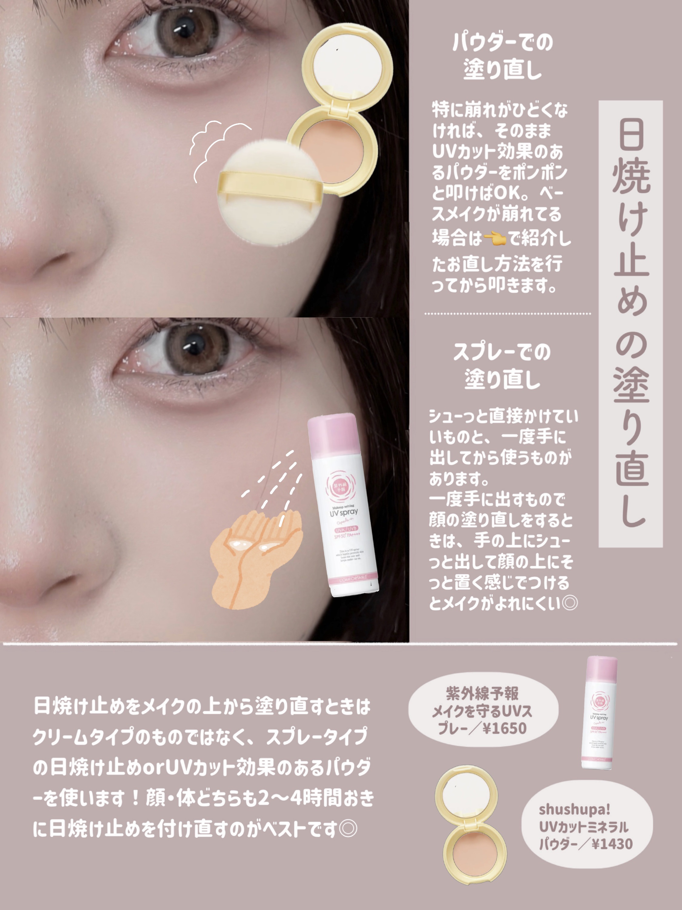 ベースメイクの順番はファンデーションの種類によっても違うのですが、 アイメイクはアイシャドウ→ビューラー→アイライン→マスカラという順番で行います。 アイメイクとのバランスを考えながら、どのリップを塗るかを決めます。 パウダーチークとクリームチークがありますが、クリームチークはムラになりやすいので初心者さんはパウダーがいいかも🙆♀️ ベースメイクの最後でもOKですが、全体のバランスを見ながら入れることでシェーディングが濃くなりすぎたりハイライトを付けすぎるなどの失敗が少なくなります。