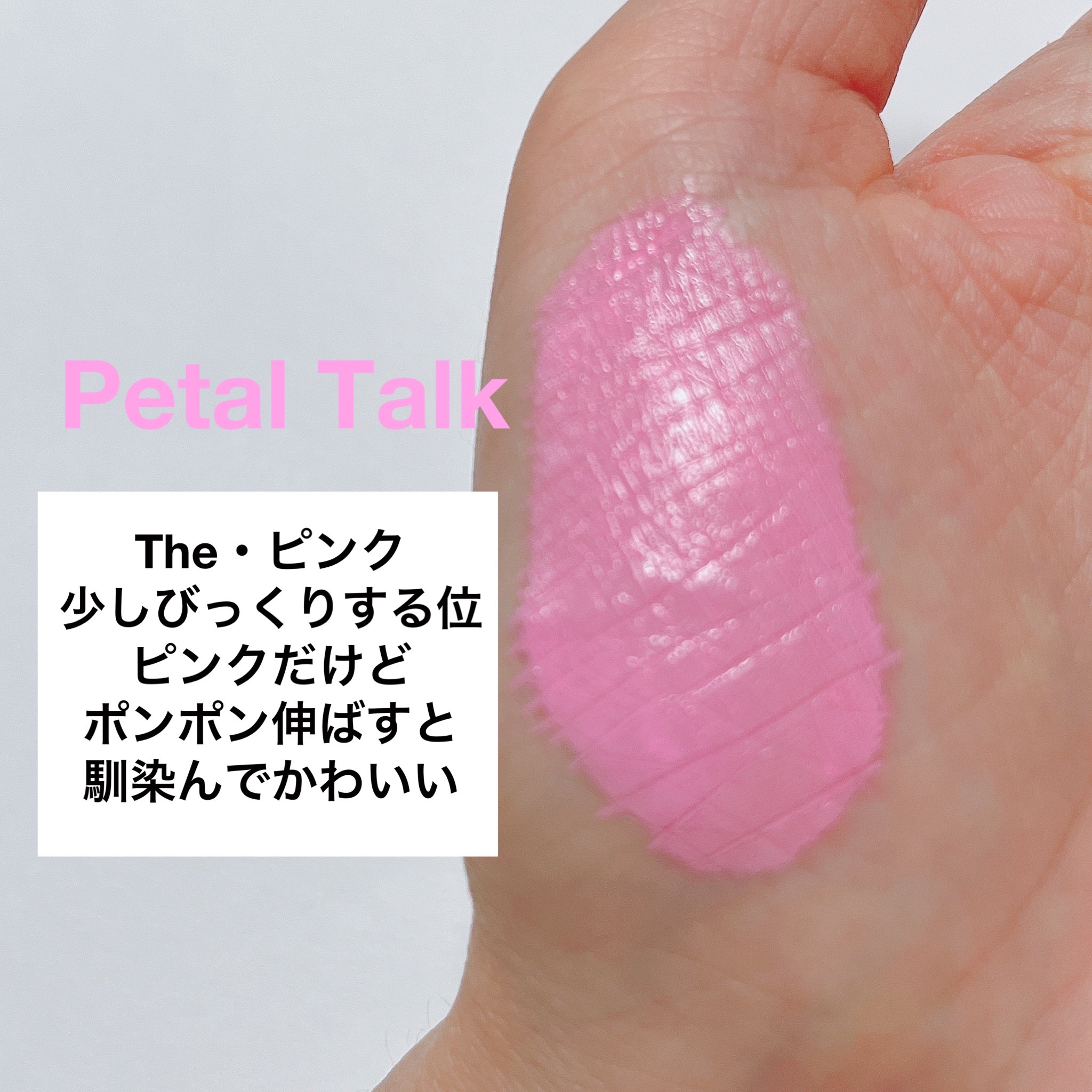 ラブケーキ 赤みのあるピンク ジュワッと内側から火照った様な発色 ペタルトーク 出すとピンクピンクでびっくり なじませるとぽわっと発色 白みピンクで肌を白く見せてくれる リキッドなのでつやがでます 普段頬にパウダーをしないので まさに求めてたチーク!!!
