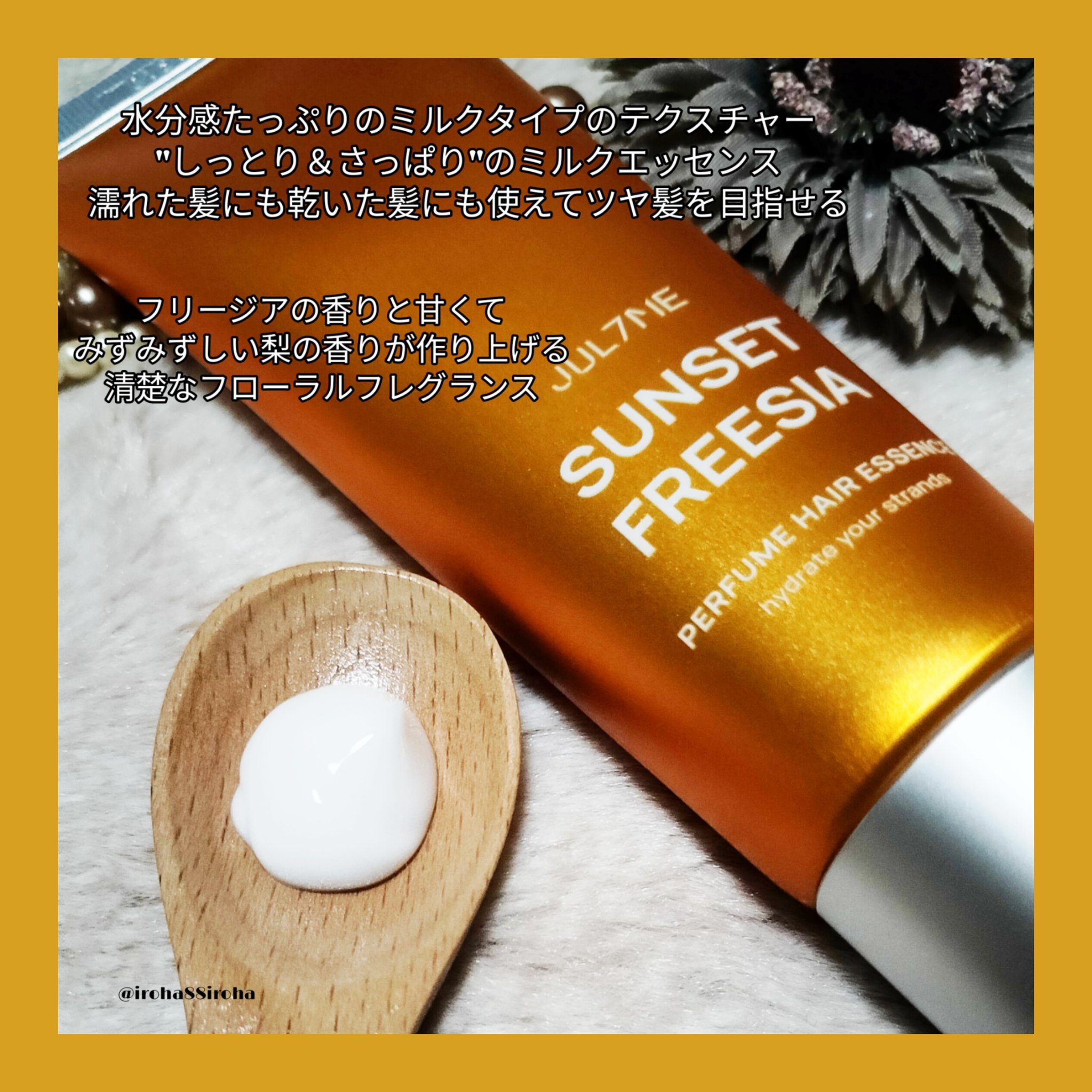 - ナイトケアや時間のない朝、お泊り、学校、会社、、など様々なシチュエーションで大活躍なJUL7MEのパフュームヘアエッセンス✨ お出かけ前にふんわりと香りをまとうヘアエッセンス。 ヘアパックに比べ、より軽やかな使用感のローションタイプで伸びが良く、乾いた髪に使用できます。お出かけ前に香水の代わりに髪になじませることで、香りが長時間持続。 ミストタイプのヘアフレグランスに比べ、香りを長時間楽しめます。植物エキスとココナッツオイル配合で髪にうるおいを補給し、ツヤ感、透明感を与えます。