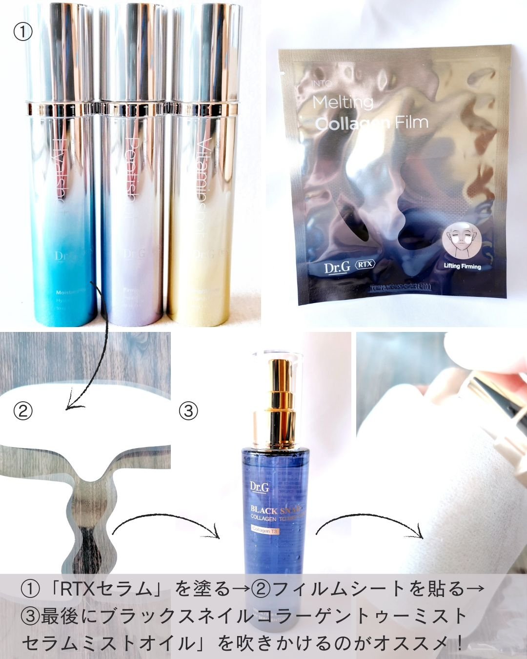 ブラックスネイル配合で、肌にしっかり栄養を与えてくれるよ!ゼリー状なのに吹きかけるときめ細かいミストに😳✨ 溶けてえるコラーゲンライルム😳✨ フィルム自体がコラーゲンのかたまりになっていて、洗顔後RTXセラムを塗った後に、コラーゲンフィルムを肌に貼り、ミストセラムをふりかけて使用するよ! ミストを吹きかけるとすーっとお肌に溶け込んで不思議な感覚✨ 手のひらに吸い付くようなもっちり感でハリも感じられて◎👌✨