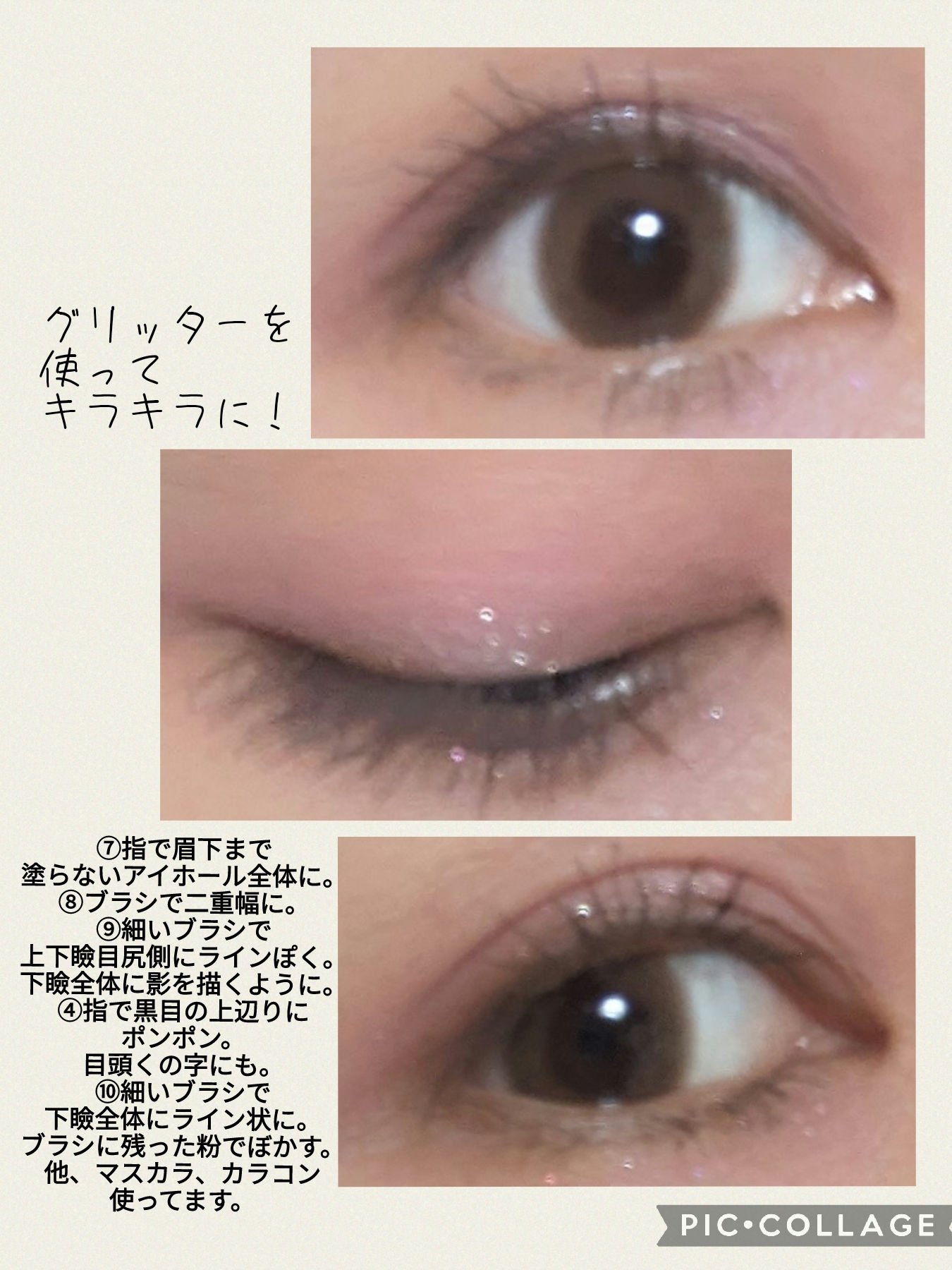 昨日のアイメイクです☆キャンメイクのプティパレットアイズ、02ボヌールマロン☆①付属の大きい方のチップで、二重幅オーバーめに塗る。②薄めに二重幅に塗る③眉下らへんに塗る。WHOMEEシングルラメシャドウ、キアラベージュ☆④指で黒目の上辺りに横...