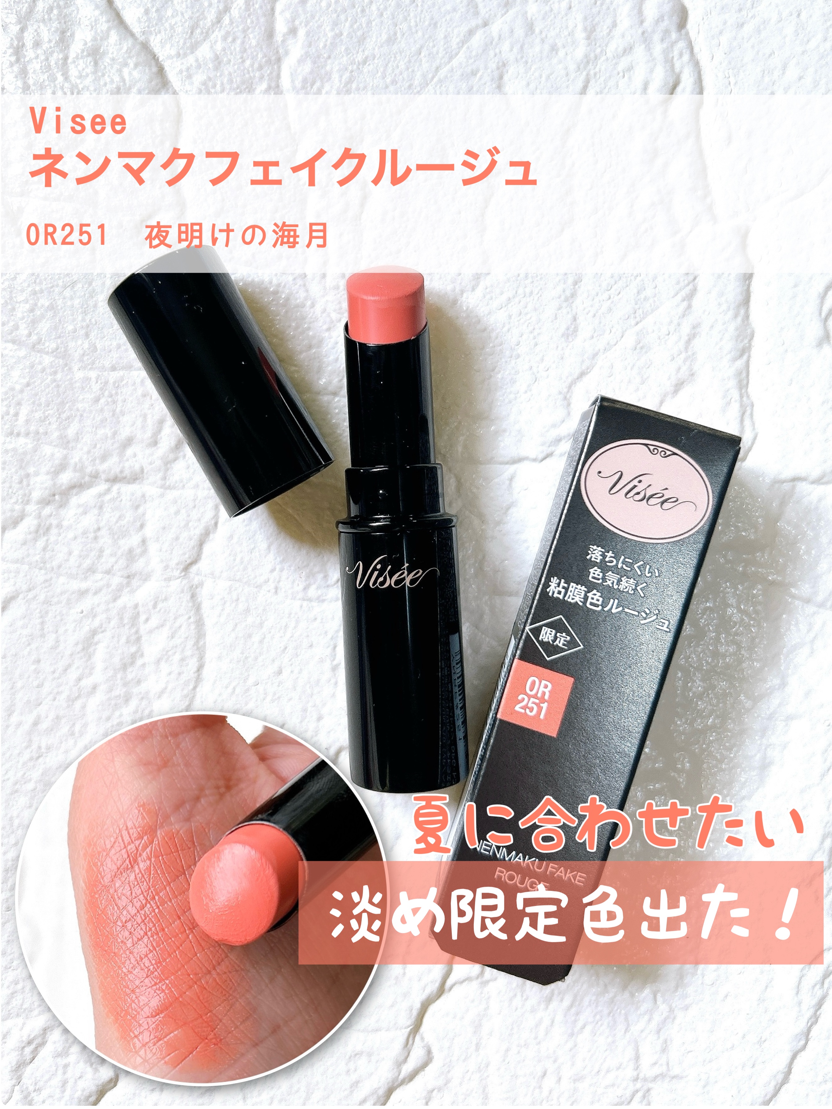 Visée ネンマクフェイクルージュ OR251 夕暮れの海月 限定 ¥1,540粘膜のような色とツヤがピタッと密着して一体化、むっちりとした色気のある唇が長時間つづくルージュ。唇の内側の粘膜のような色・質感を再現した粘膜カラーが、唇の血色を...