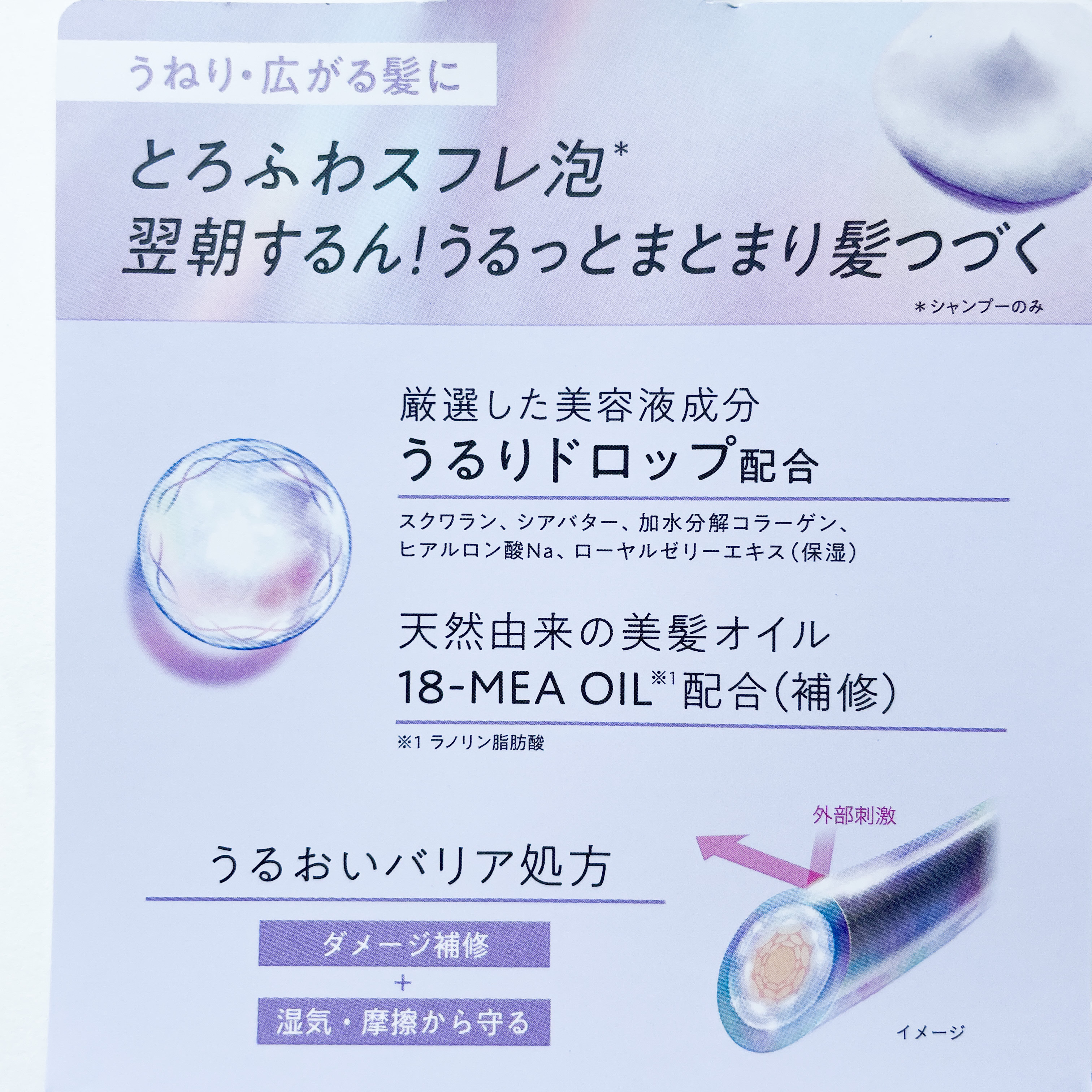 - ※2025年9月6日〜順次パッケージと香りをリニューアル。尚、リニューアルにかかる返品交換等は承っておりません。 New!Z世代トレンド研究からうまれた香り Z世代トレンド研究からうまれたときめくホワイトピーチ&ムスクの香りにリニューアル <シャンプー> うねり*1・広がる髪に。とろふわスフレ泡でやさしい使い心地で洗う。するん!うるっとまとまり髪つづく。 ●花王独自原料配合で、スフレのようなとろふわ泡 ●厳選した美容液成分うるりドロップ配合(保湿) (スクワラン、シアバター、加水分解コラーゲン、ヒアルロン酸Na、ローヤルゼリーエキス、ラウロイル加水分解シルクNa、ポリクオタニウム-52) ●アミノ酸系洗浄成分使用 ●サルフェートフリー処方 ●天然由来の美髪オイル 18-MEAOIL*2配合(補修) ●ダメージ補修+湿気・摩擦から守る うるおいバリア処方 ●ときめくホワイトピーチ&ムスクの香り <コンディショナー> うねり*1・広がる髪に。集中補修&コート。するん!うるっとまとまり髪つづく ●厳選した美容液成分うるりドロップα配合(保湿) (スクワラン、シアバター、加水分解コラーゲン、ヒアルロン酸Na、ローヤルゼリーエキス、乳酸) ●モイストオイル配合(保湿)(アルガンオイル*3、ヒマワリ種子油、グリセリン) ●天然由来の美髪オイル 18-MEAOIL*2配合(補修) ●ダメージ補修+湿気・摩擦から守る うるおいバリア処方 ●ときめくホワイトピーチ&ムスクの香り *1 乾燥による *2 ラノリン脂肪酸 *3 アルガニアスピノサ核油