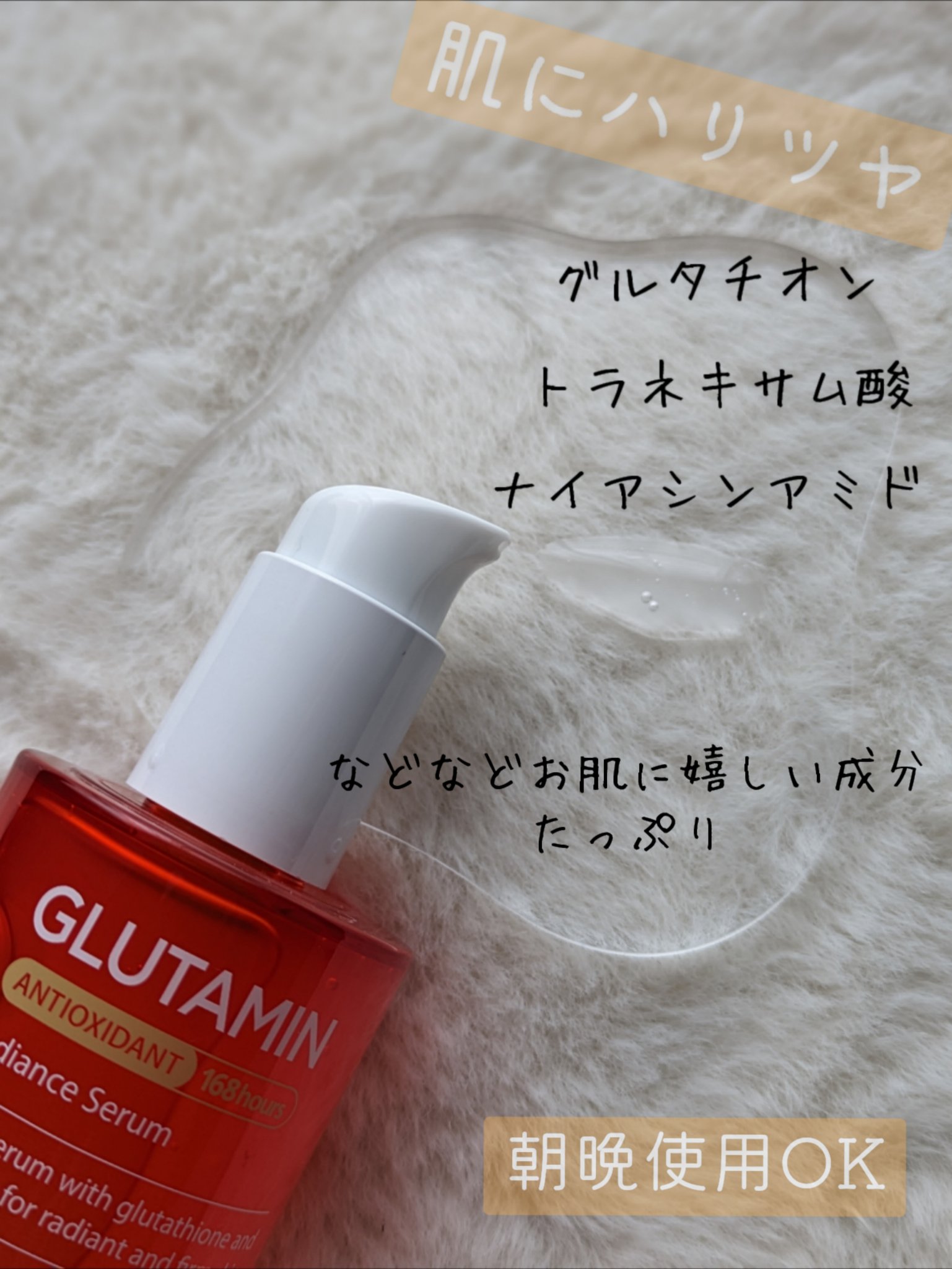 グルタチオン・ビタミン5種・トラネキサム酸を配合した美肌抗酸化ケア美容液🧡 肌のツヤ、肌トーン、弾力、色素沈着にアプローチしてくれるよ👍🏻 抗酸化の核心成分グルタミン™を35.250ppm配合 グルタチオン、ナイアシンアミドをはじめとするビタミン成分がたっぷり✨️ しっとり保湿してもち肌に😌 香りもしないから朝晩使いやすい👍🏻
