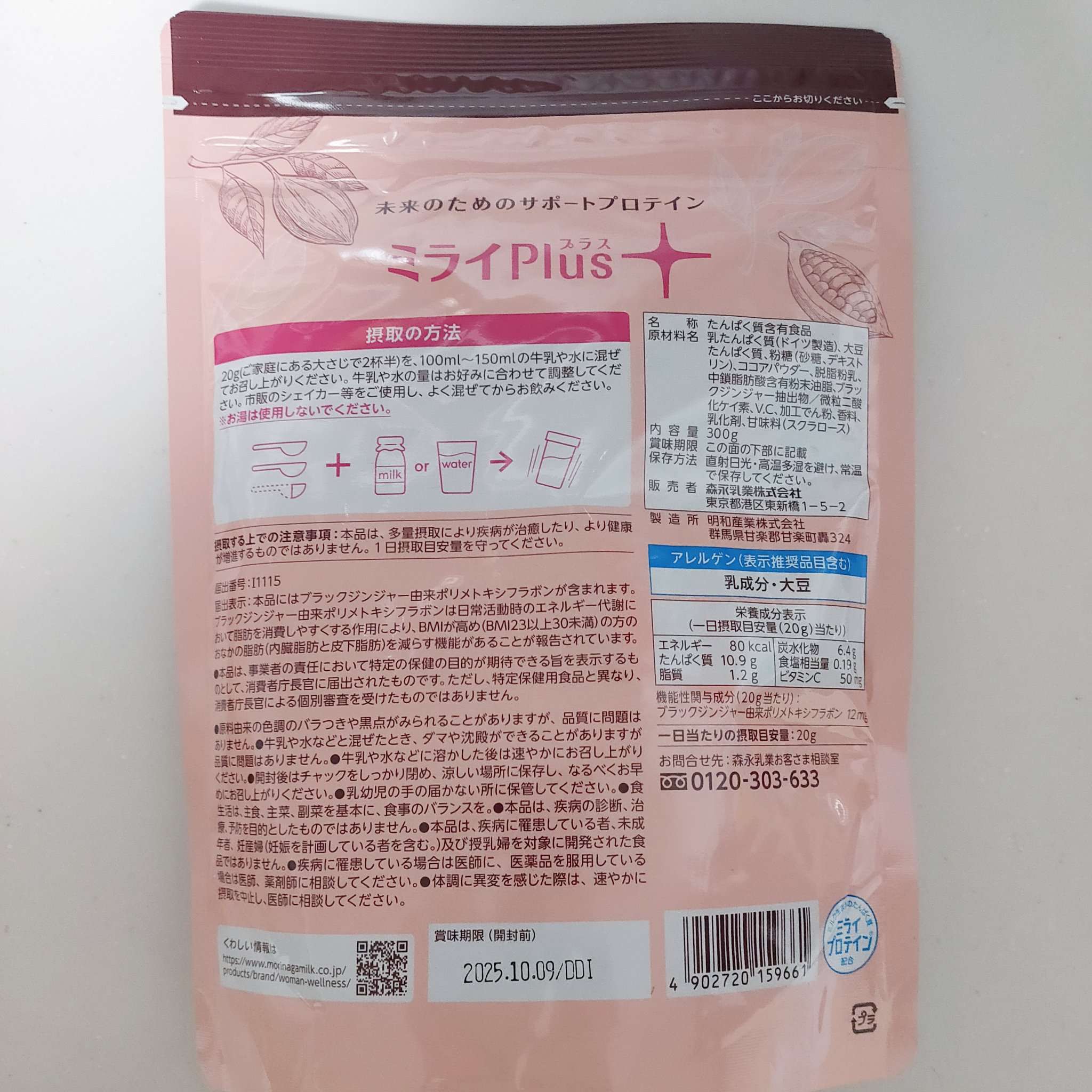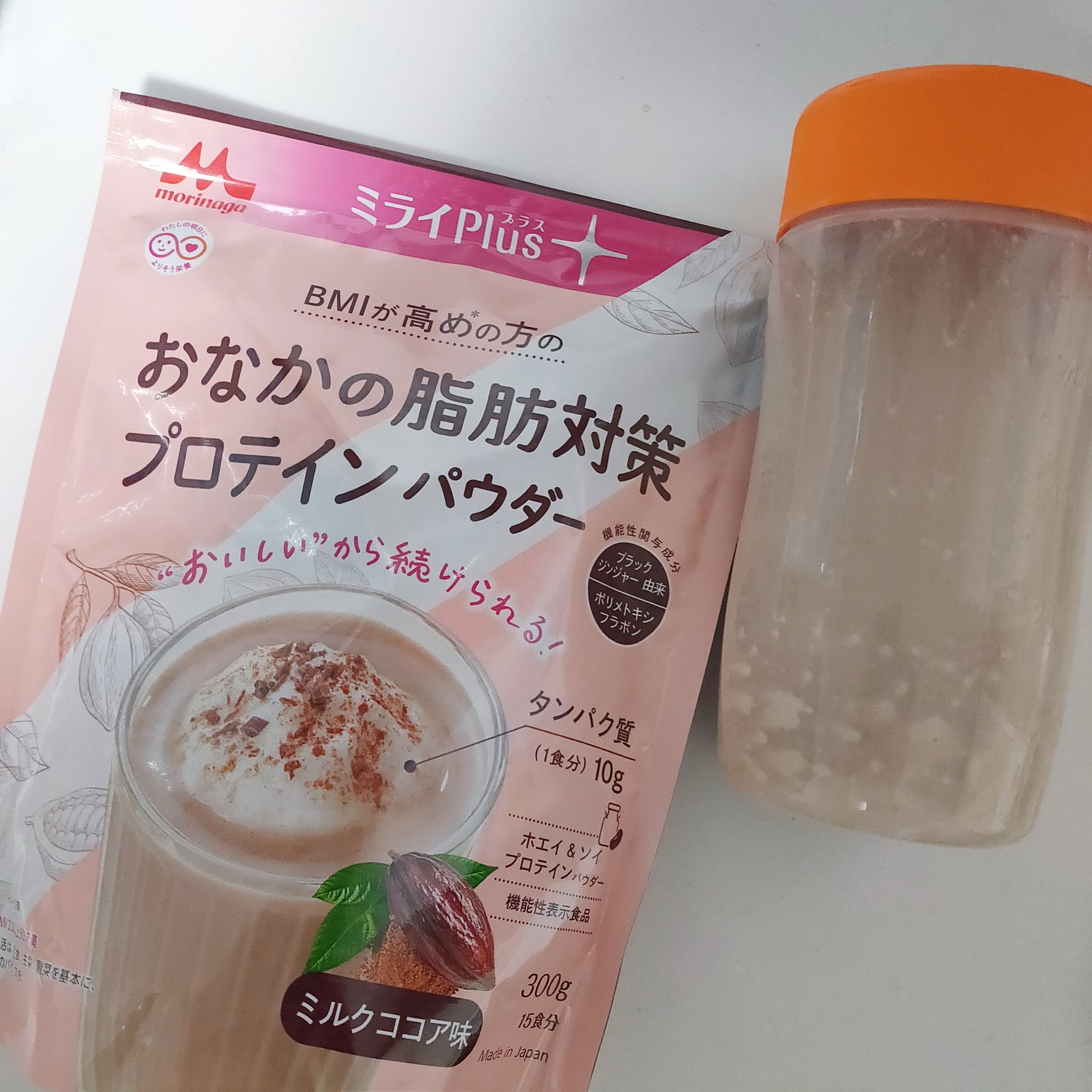 森永 ミライPlusおなかの脂肪対策プロテインパウダー試供品をいただきました。ミルクココア味BMIが高めの方のおなかの脂肪にアプローチするブラックジンジャー由来ポリメトキシフラボン配合の機能性表示食品女性の健康と美に大切なタンパク質を1食あた...
