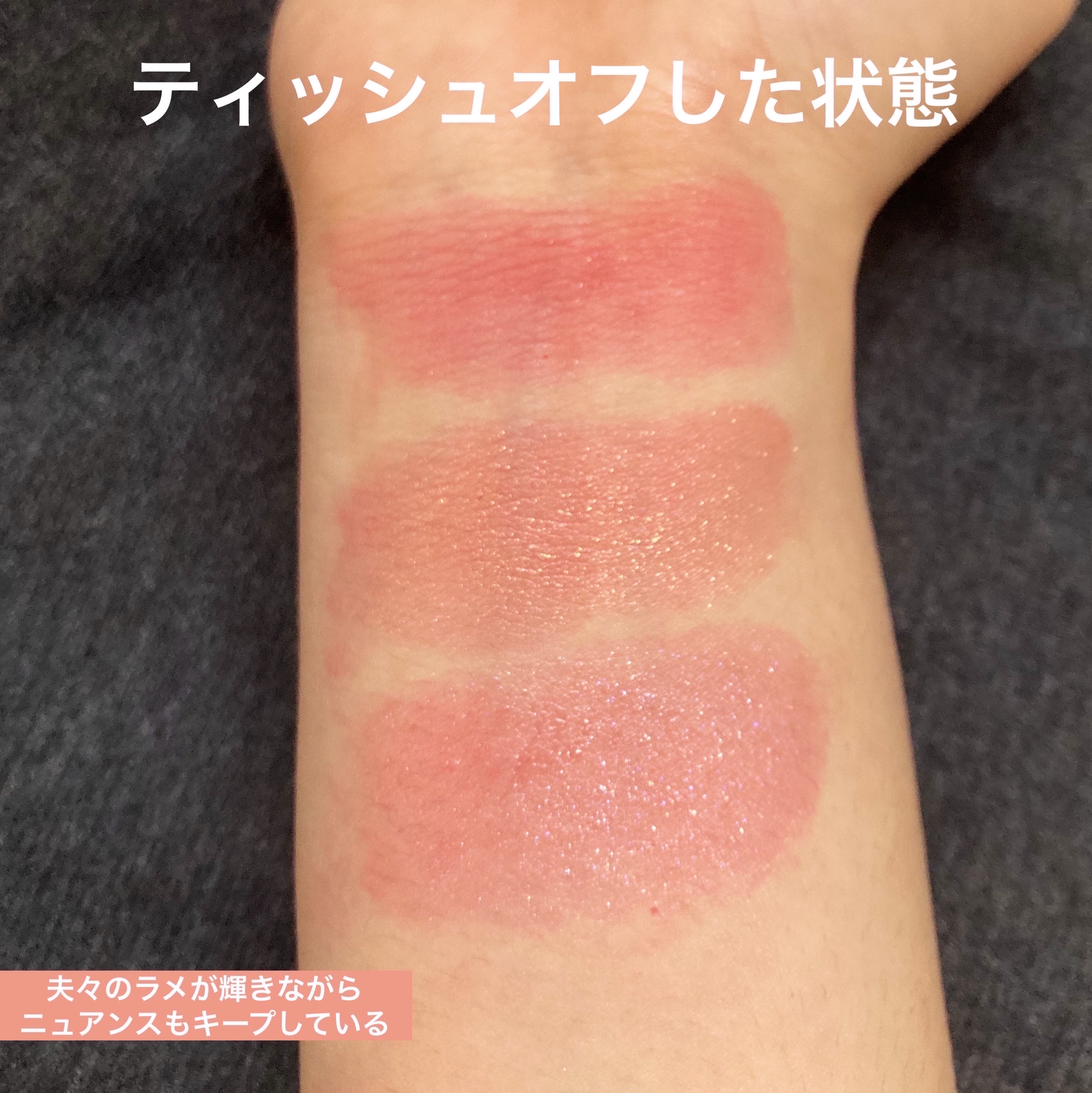 やや硬さが有りながらも、とろりと滑らかに 塗布しやすいリップ とろり塗りはスティックと近い発色となり 素の唇ながら、しっかりと色も感じる仕上がり どちらの塗り方でもシアー感が有り素の唇から 離れ過ぎず浮かない仕上がり