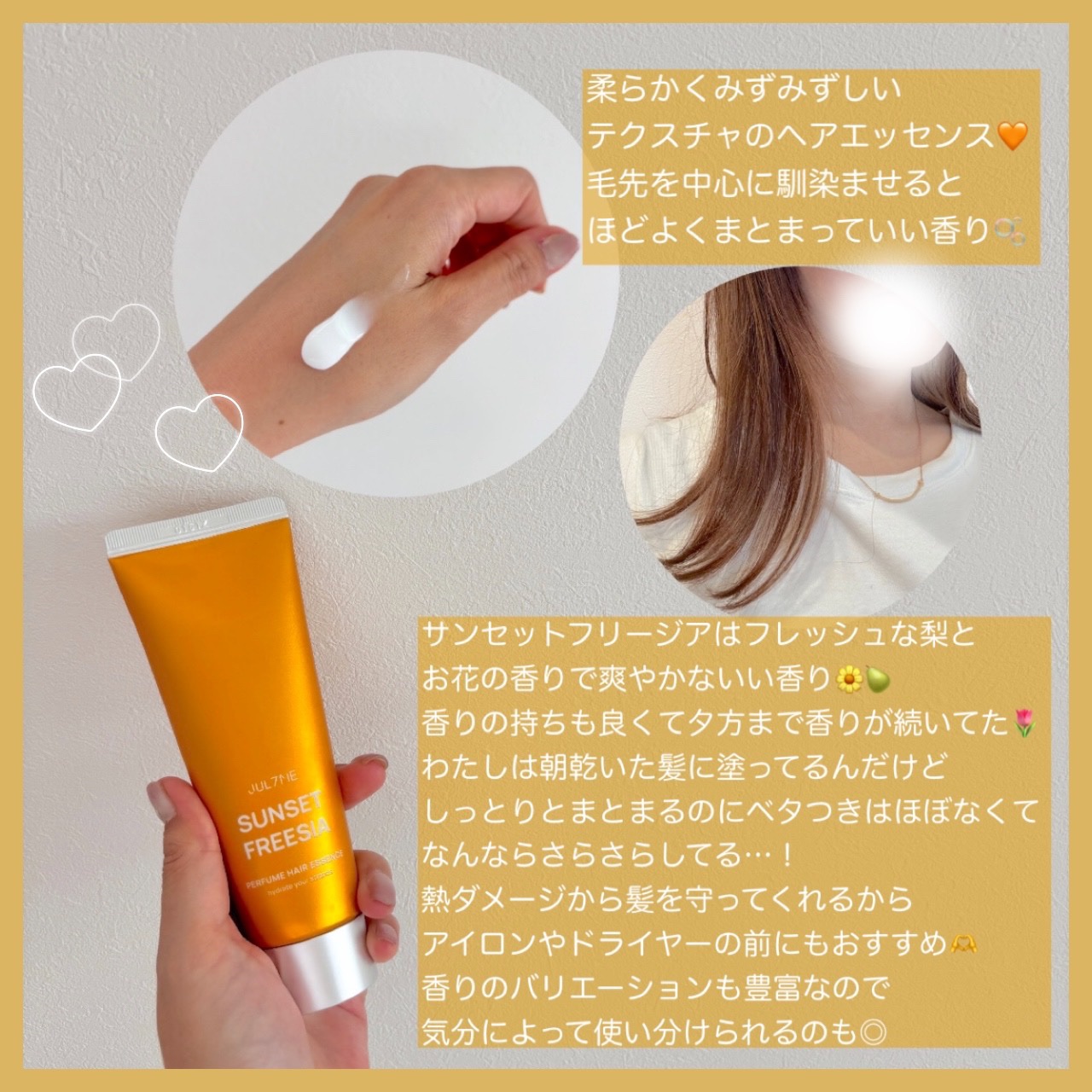 - ナイトケアや時間のない朝、お泊り、学校、会社、、など様々なシチュエーションで大活躍なJUL7MEのパフュームヘアエッセンス✨ お出かけ前にふんわりと香りをまとうヘアエッセンス。 ヘアパックに比べ、より軽やかな使用感のローションタイプで伸びが良く、乾いた髪に使用できます。お出かけ前に香水の代わりに髪になじませることで、香りが長時間持続。 ミストタイプのヘアフレグランスに比べ、香りを長時間楽しめます。植物エキスとココナッツオイル配合で髪にうるおいを補給し、ツヤ感、透明感を与えます。