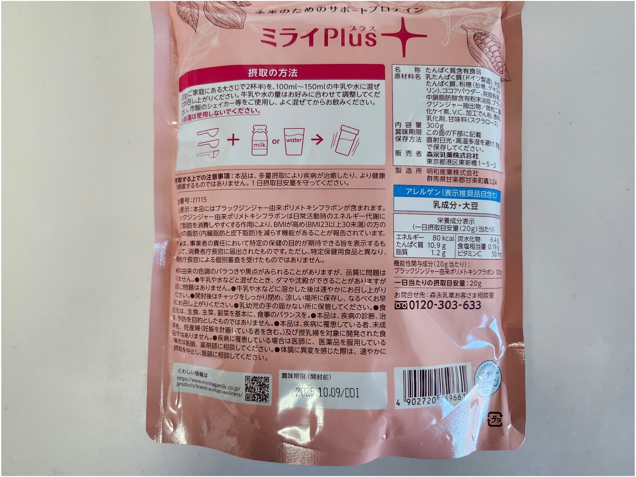 森永 ミライPlusおなかの脂肪対策プロテインパウダー試供品をいただきました。ミルクココア味BMIが高めの方のおなかの脂肪にアプローチするブラックジンジャー由来ポリメトキシフラボン配合の機能性表示食品女性の健康と美に大切なタンパク質を1食あた...