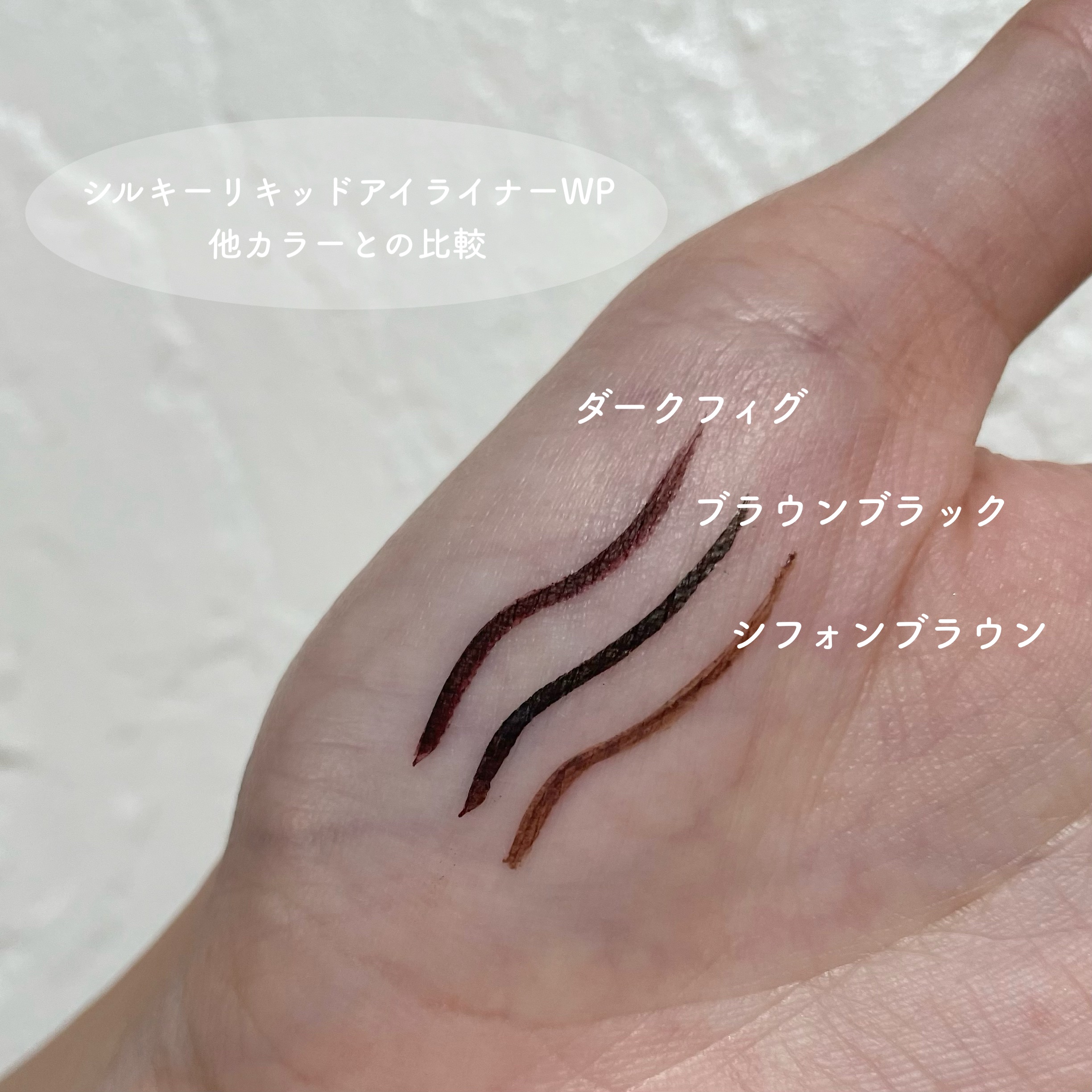 - 筆先までずっとなめらか、目尻で感動するリキッドアイライナー。 必要な量が肌にのる新設計で、まぶたの上をすべるような、滑らかな描き心地。しなやかでコシのある筆が、筆圧のコントロールを容易にし、太いラインも細いラインも思い通りに仕上げます。水、汗、涙に強いウォータープルーフタイプなのに、通常洗顔で簡単オフ。肌に色素が残らない顔料を使用。5種類の美容液成分を従来品の200%配合し、メイクしながら目元ケアまで。 ●ブラウンブラック ※2020年9月12日 バラエティショップ先行発売 ●漆黒ブラック ※2020年12月頃発売予定 ●ナチュラルブラウン ※2020年12月頃発売予定 ●シフォンブラウン 「毎日メイクに透明感と抜け感」 ブラウンでも、グレーでも、ベージュでもないニュアンスカラー。 自然な印影で素の目元を際立て、頑張りすぎない、ふんわりとした目元に。 ●アプリコットブラウン 「じゅわっと血色感。 肌に馴染むおしゃれカラー」 温かみのあるアプリコットがじゅわっと滲む血色感を目元に演出。 肌馴染みが良いので、カラーライナーに抵抗がある方もブラウンの延長線上で楽しめる、使いやすい色味です。 ”ちょっとオシャレ”な空気感を演出するカラー。 ●ピンクショコラ アイライナー 「ピンクが溶け込む濃厚ブラウン」 肌馴染みが良く、目元にじんわり血色感をプラス。 さりげなく女性らしさが加速するようなカラー。 ●ピスタチオラテ (2022年7月29日(金)発売) 「“目尻”に抜け感アクセント」 肌に馴染むのに映える絶妙なグリーン。 トレンドカラーに“くすみ”と“抜け感”をプラスしたまろやかな発色。 ●マスタードブラウン 「“イエロー”が揺れる、大人の洒落色」 (2022年7月29日(金)発売) まるで太陽のような暖かさを感じる新しいブラウン。 ほんのり感じるイエローでメイクが一気に垢抜ける稀有な色。 ●シフォンピンク(2023年2月10日発売) 「ふんわり柔らか"まろみピンク"」 甘くなりすぎない青みニュアンスで目元の透明感UP。 目元を引き締め、ピンクメイクにありがちな腫れぼったさを解消。 ●ミルクカプチーノ(2023年4月21日発売) まろやかな深みの“優しい締め色” どんなメイクにも合わせやすいカラー。 自然な陰影でさりげなく目幅を拡張します。 ●グレーカシミア(2023年10月1日発売) ブラウンがほんのり溶け込んだ、暖色グレー まろやかな発色で、パーソナルカラーを問わず肌に馴染む 目元の陰影になりすまし、抜け感と目力を欲張りに叶える ●ダークフィグ(2024年6月1日発売) するする”なめらか。描きやすいのに、落ちにくい。 クッキリ可愛いほの甘ダークブラウン ●ピーチモカ(2024年8月1日発売) ふわっと自然に盛れる“桃色ブラウン” ほんのり血色感で目元にうるみ感を演出 ●スターダストブラウン(2024年12月11日発売) キラッと繊細に輝く''星屑ブラウン'' 透け感のあるダークブラウンの色味とラメの輝きが、目元に艶のある立体感を演出 ●チャコールモカ(2025年4月10日発売) 目元を締める''深みグレージュ'' 黄みや赤みに偏りすぎない絶妙な色設計で、自然に目元を強調