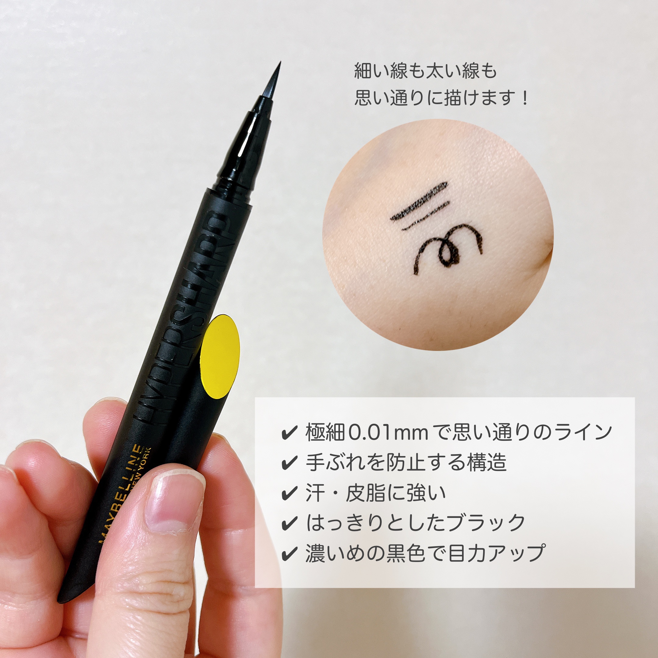 - 極細0.01mm *1で狙いどおり ブレずに一発!*2 秒で盛れる、アイライナー。 超極細0.01mmライン*1 、なのに使いやすい安定感 細さにこだわった0.01mm の筆先*3 。だから、どんなラインも思い通り。 しかも重みのある手ブレ防止ボトルで、ラインがブレずに安定。 ウォータープルーフタイプで、一日中キープ*2 *1 最細で描けるライン幅のこと。メイベリン ニューヨーク調べ。 *2 メイベリン ニューヨーク調べ。個人差があります。 *3 ブラシ先端0.005mm