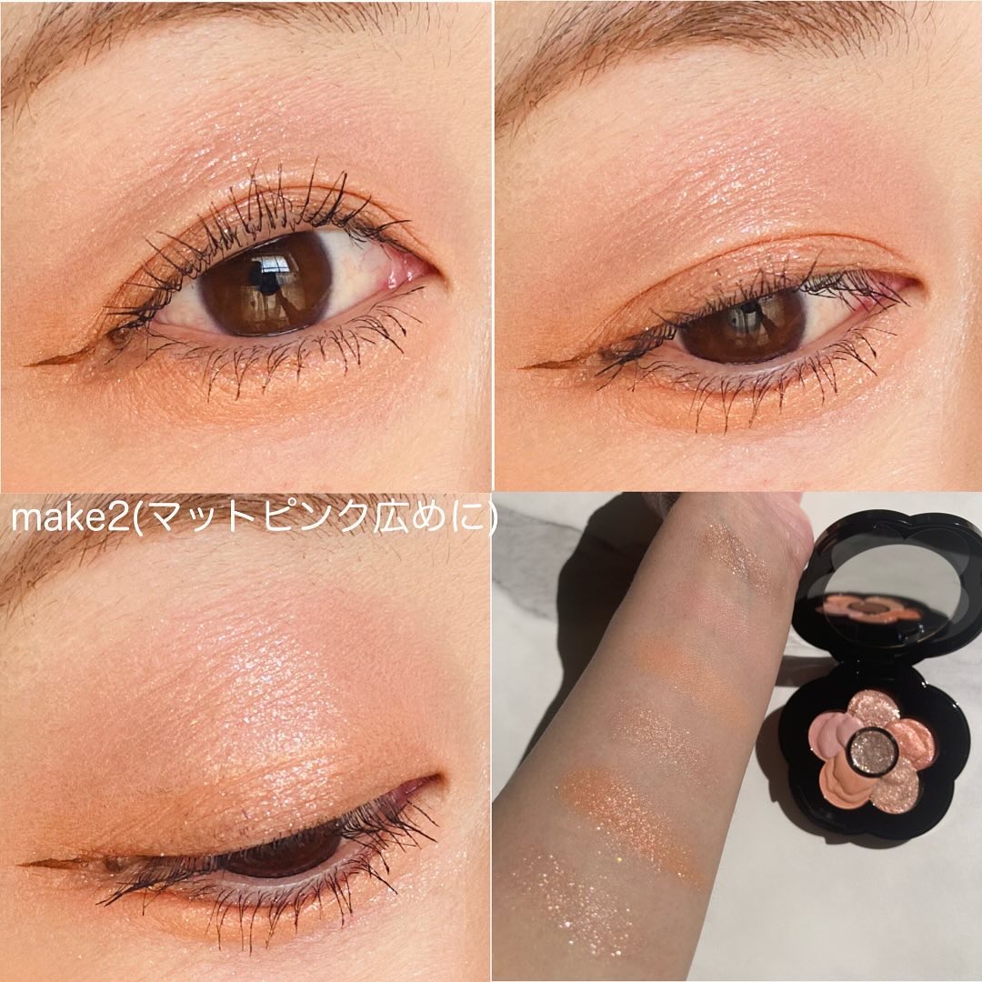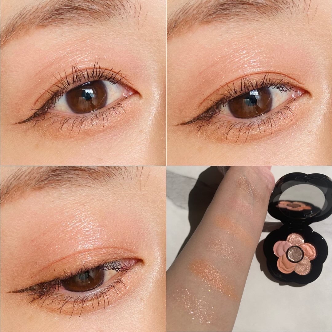 マットは肌に溶け込むような粉質でボソボソしません! シマーのしっとりした粉質も密着してくれて好き!!! 1番キラキラなのは右上のラメですね🍑💓でも粒が大きくないので、大人も使いやすいラメだと思います🥰 どの色使おうか迷うけど、どれ使っても本当可愛くて、自分が桃になったかのような🍑(笑)多幸感あふれるパレットです💘