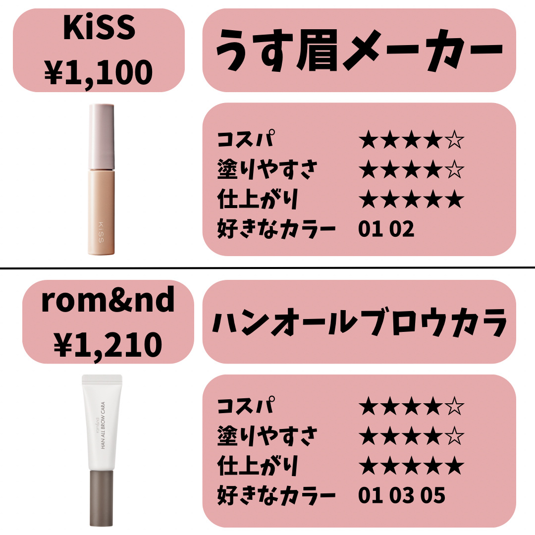 暗髪さんやアッシュ系ヘアの方におすすめのアイブロウマスカラKiSSはブリーチなしでも、簡単に今どきのうす眉に地肌にもつきにくくて、アイブロウぶらしでとかすと普段使いもしやすいですrom&ndはこの中ではピカイチの耐久性!地肌につきやすい...