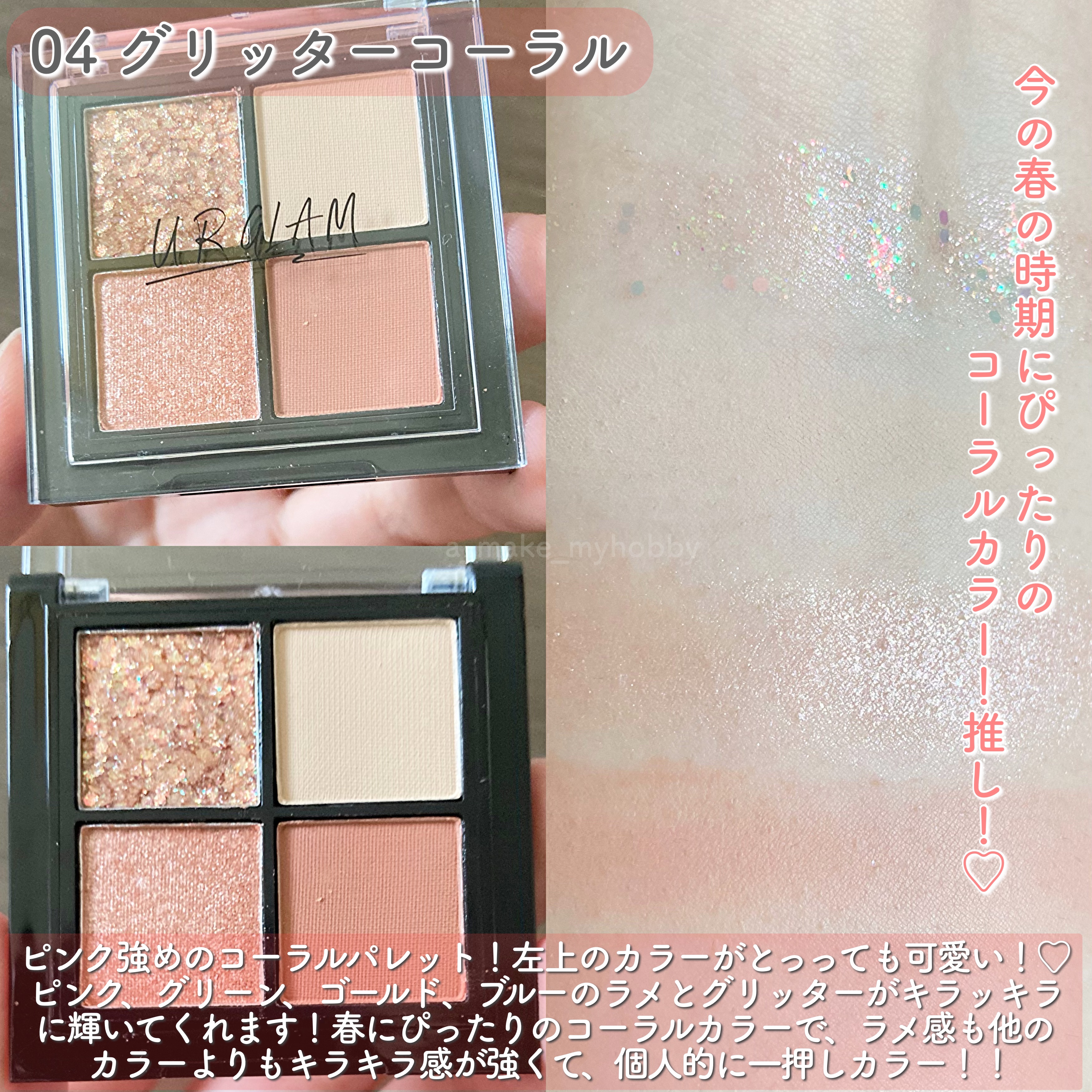 \PC問わず⁈コーラルブラウン/【URGLAMグリッターアイズ】☑️¥110☑️04グリッターコーラル肌なじみコーラル。グリッターとパール、マットカラーが楽しめる4色パレット🎨左下④やわらかなコーラルブラウンカラーがPC問わずなじみが良く、上...
