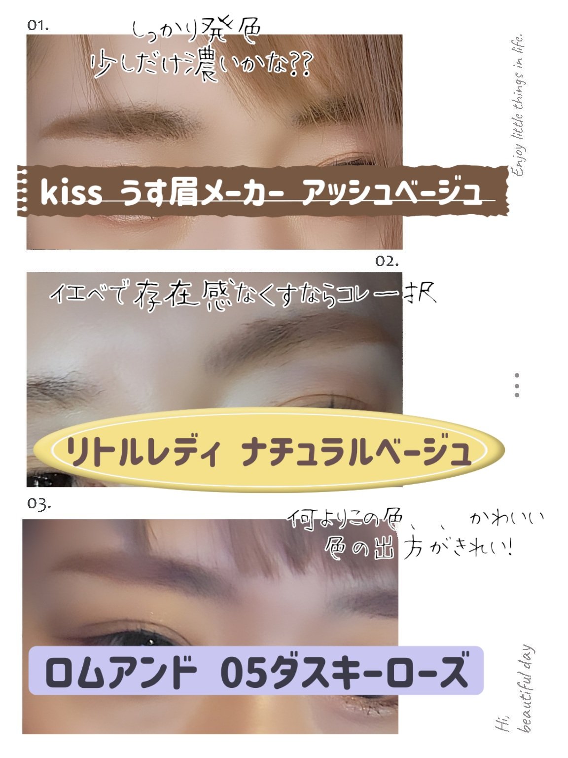 一番地肌につきにくい かなり高発色で、サッと眉色チェンジできる 自然にふわっとした眉毛になる 特にこれといった欠点は見つからず使いやすかった 柔らかい印象の眉毛になる 一番液含みがよくてべちゃっと地肌につきやすい