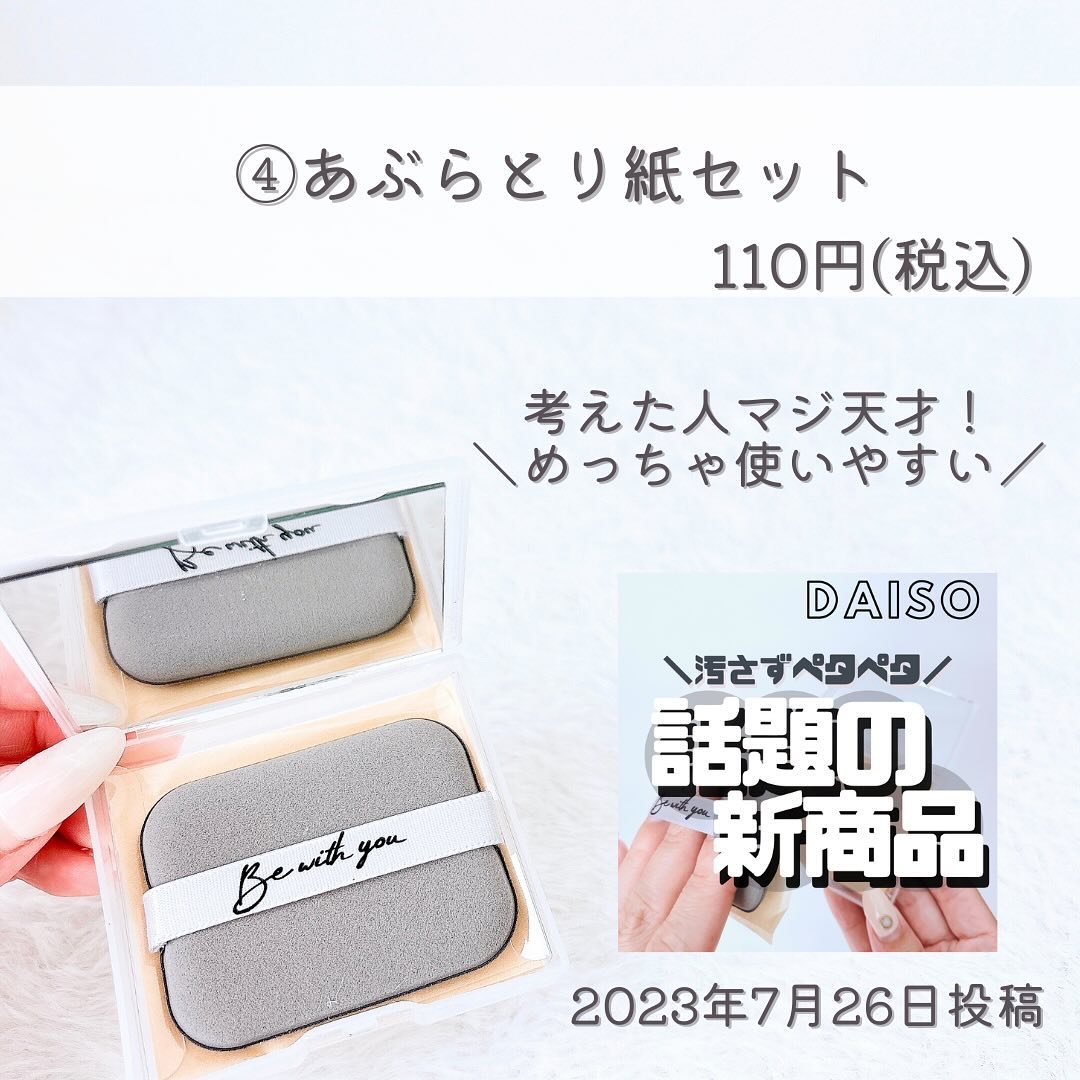 最近は暑さに加えて湿気もヤバいよね🥵💦100均にもテカリやベタつきが気になるお肌に使いたいアイテムがこんなに🎶#ダイソーや#セリアで是非チェックしてみてね🤍´-#ダイソー購入品#セリア購入品#ダイソー新商品#セリア新商品#100均購入品...