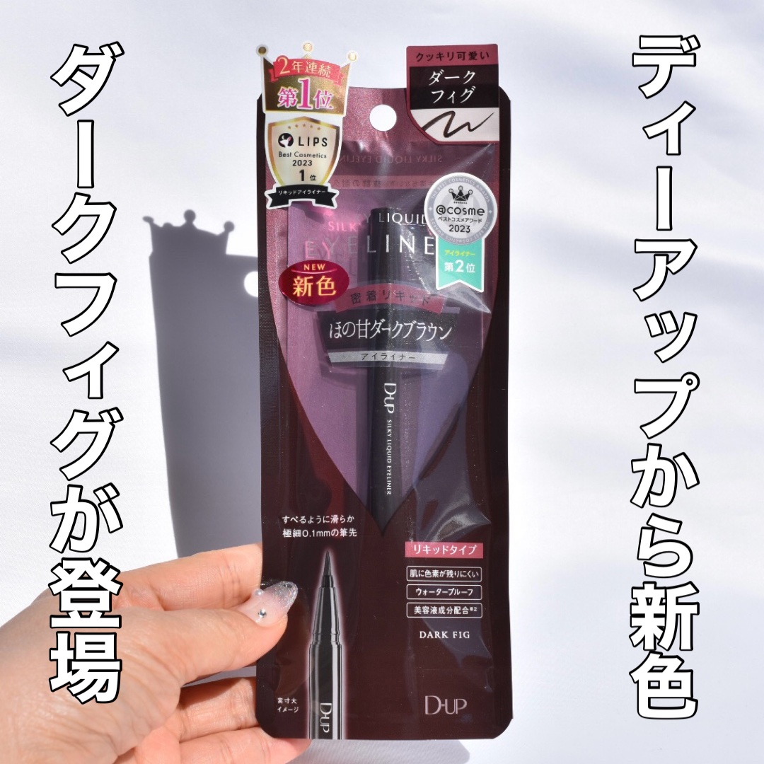 D-UPのアイライナーは、なめらかな描き心地で細い線も描きやすい!! 汗や涙にも強く、落ちにくいです。 カラー展開豊富で、オシャレなカラーが多い♡ ダークフィグは、赤みのある焦げ茶っぽいカラー。 ブラックに比べで肌馴染みがよく、程よい抜け感が出て、他には中々ない色味でお気に入り♡