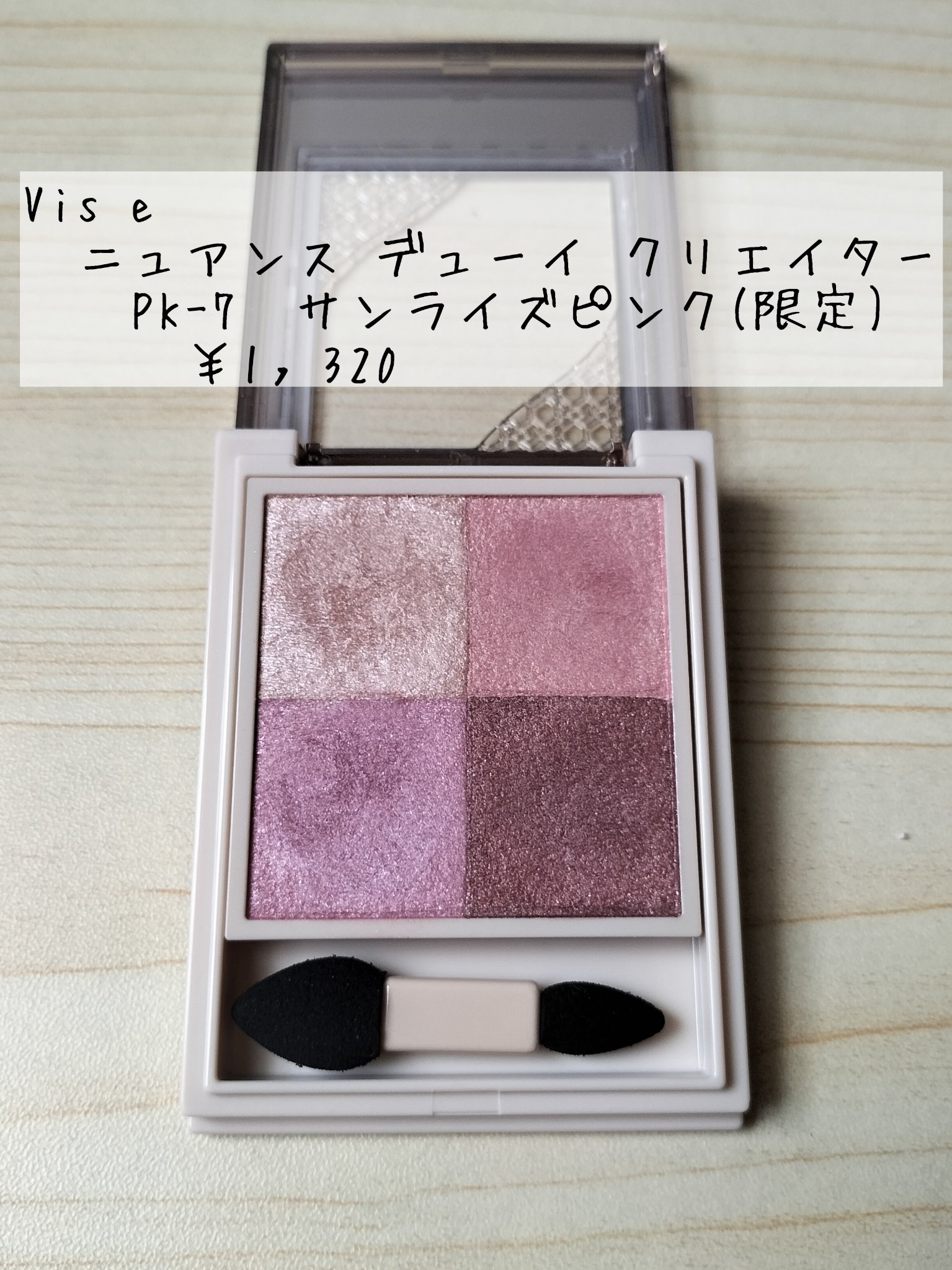 マツキヨでは販売されてたよ。写真じゃ上手く伝わらないけど、右上と左下の色が凄く綺麗。左上と右上はゴールドパールが含まれてそうな感じ。これが限定なんて勿体ないな。『紹介したコスメ』・Visée ニュアンスデューイクリエイター PK-7 サンラ...
