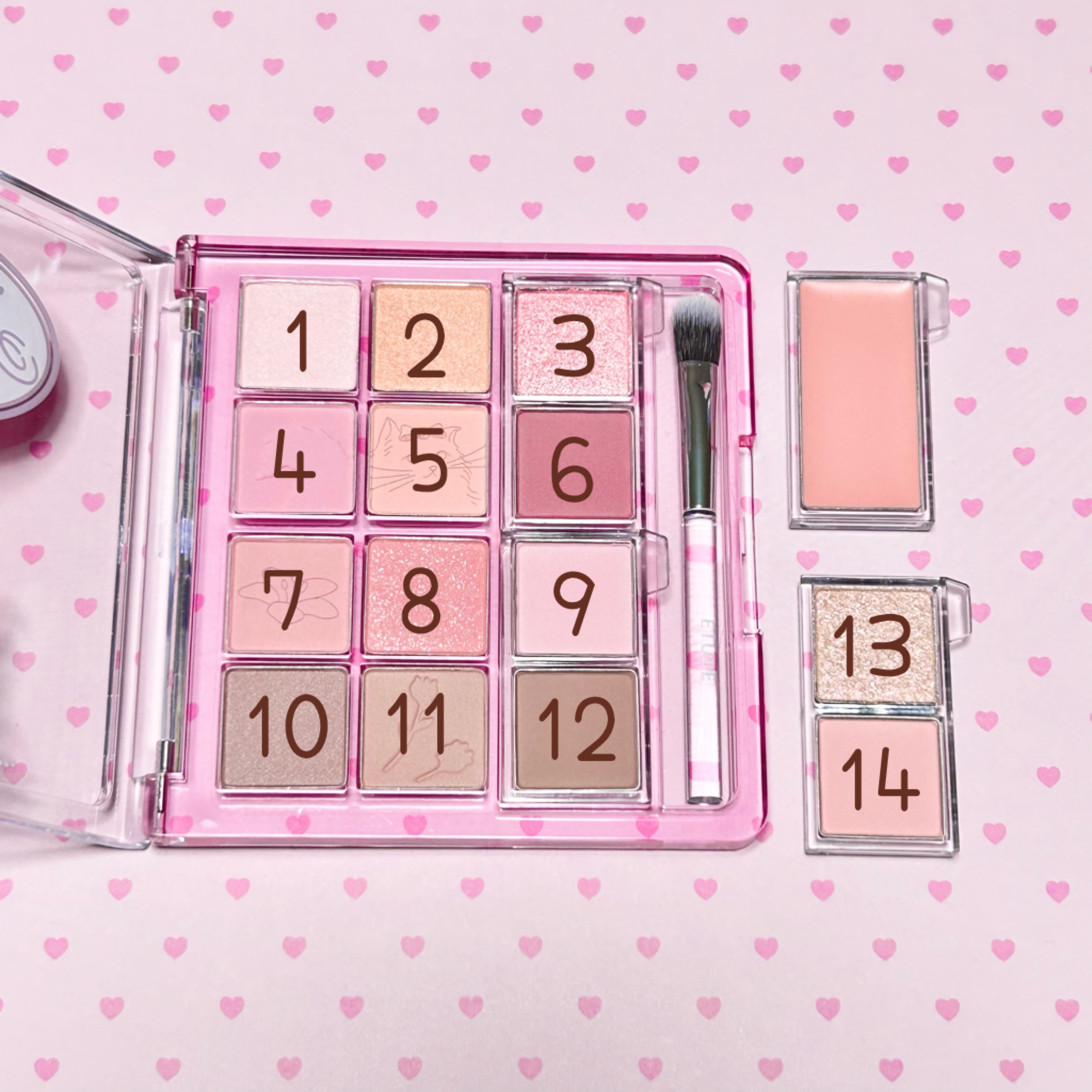 特にお気に入りのカラーは以下の4つです♡ ①上段左から1番目 マットホワイトピンクは涙袋やハイライトとしてすごく重宝します。 ②上段左から4番目 キラッキラのピンクシルバーラメで、上瞼の真ん中にポイントで置くとすごく可愛い♡ こんなキラキラなのにラメ飛びもしないです。 ③下段左から5番目 ラメが入ったマットカラーで、こっくり深いピンクブラウンです。 柔らかい雰囲気の締め色になるし、他のマットピンクともグラデを作っても可愛いです。 ④下段右から1番目 シマーパールなピンクブラウンです。 すごく上品な艶感が出ます。 涙袋陰影やメインカラーに使えます。 マットは発色がよく、ラメは飛びにくく、質もすごく良かったです。 さすがクリオ! 毎日使うのが楽しみです♡