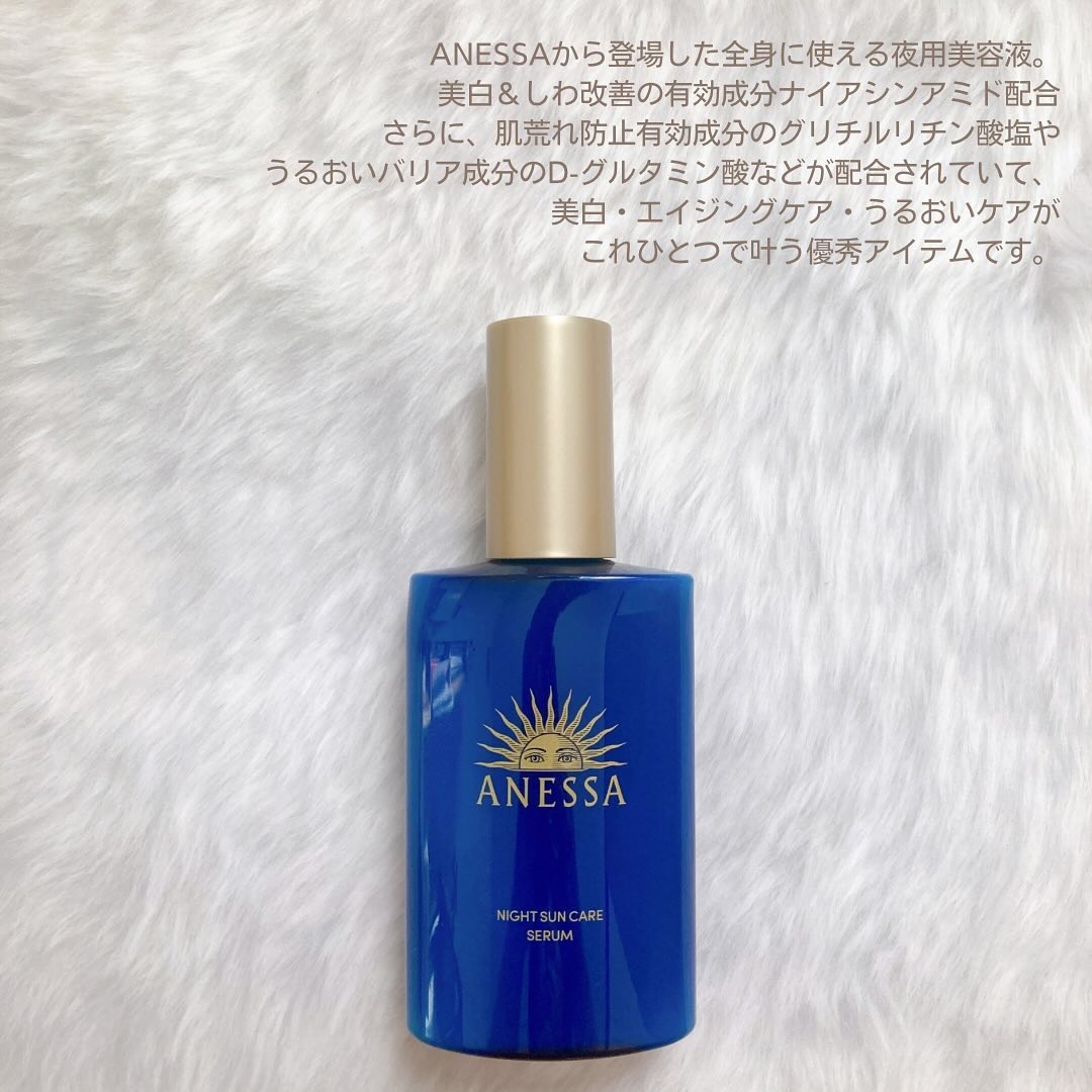 こんばんは🌙*゚もー暑すぎて溶ける🤣ANESSAナイトサンケア美容液アネッサのオンライン体験会に参加してきたよー(♡´꒳`*)▶1本で美白*ケア&しわ改善全身美容液。▶ナイアシンアミド配合で美白*1ケアしながら、しわ改善まで。▶清々しい...