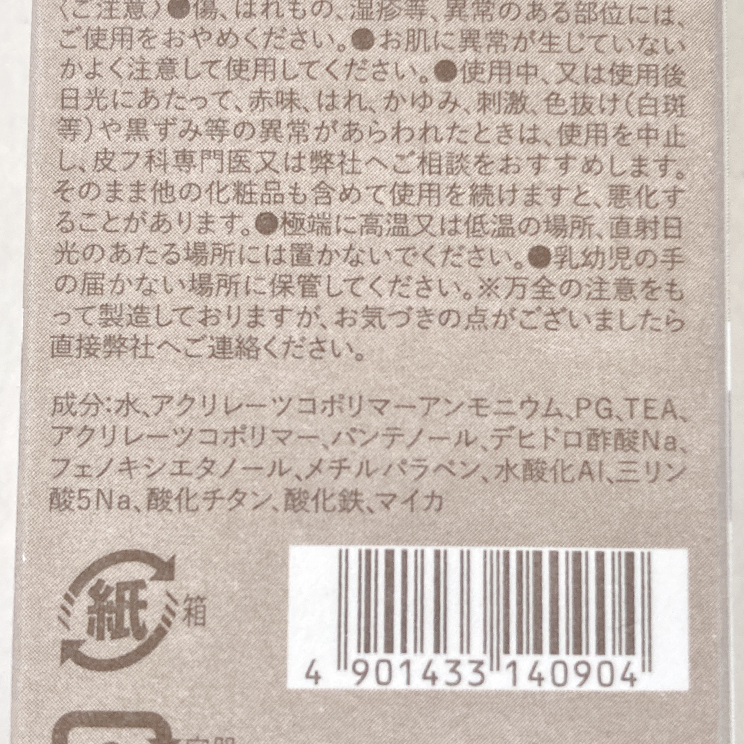 - <01 ピンクベージュ> 水、アクリレーツコポリマーアンモニウム、PG、TEA、アクリレーツコポリマー、パンテノール、デヒドロ酢酸Na、フェノキシエタノール、水酸化Al、メチルパラベン、三リン酸5Na、プロピルパラベン、酸化チタン、酸化鉄、マイカ <02 アッシュベージュ> 水、アクリレーツコポリマーアンモニウム、PG、TEA、アクリレーツコポリマー、パンテノール、デヒドロ酢酸Na、フェノキシエタノール、メチルパラベン、水酸化Al、三リン酸5Na、酸化チタン、酸化鉄、マイカ <03 ミュートグレージュ> 水、アクリレーツコポリマーアンモニウム、PG、TEA、アクリレーツコポリマー、パンテノール、デヒドロ酢酸Na、フェノキシエタノール、メチルパラベン、水酸化Al、三リン酸5Na、酸化チタン、マイカ、酸化鉄、グンジョウ