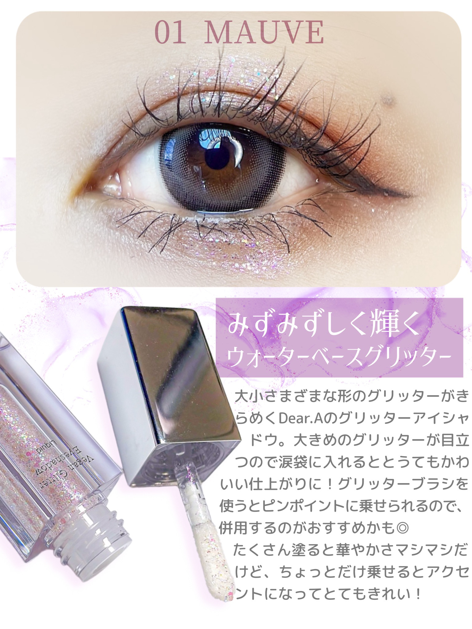 グリッターシャドウは53%以上がウォーターベースなので大きめラメなのにザラついたりせずピタッと瞼に密着してくれます✨ ハイドロデュイティントはサラッとしっとりな水分感で発色も色持ちも抜群です👍🏻 どちらもカラー名がモーブなのでシックかつ可愛さのあるメイクがしたい時にオススメしたいアイテムです💜