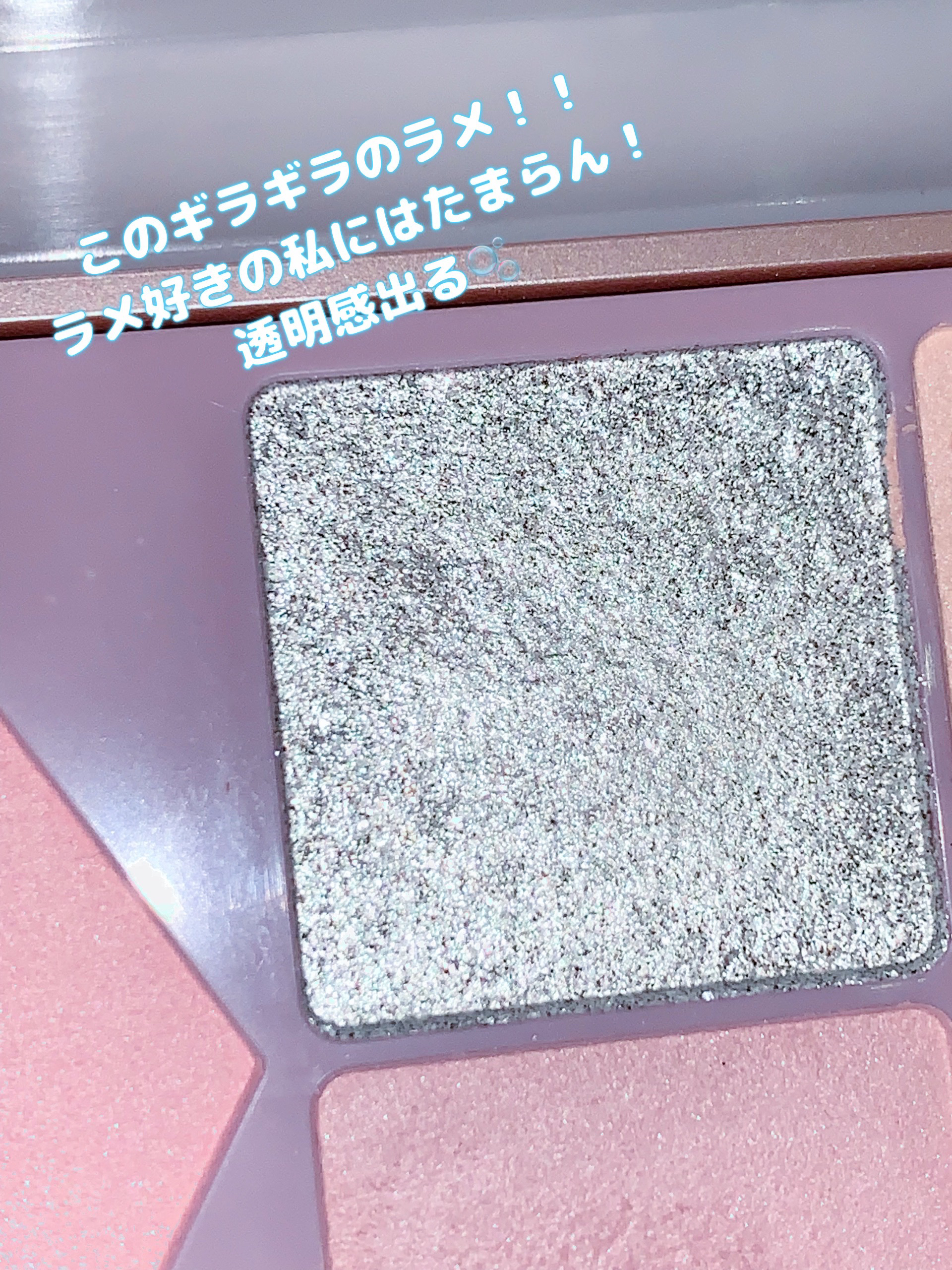 可愛いピンクで、色味も使いやすいし、なりより左上のキラキラがとっても気になって、手に入れました!! 全体的に可愛らしい青み感があります。 粒子がとても細かくて、しっとり