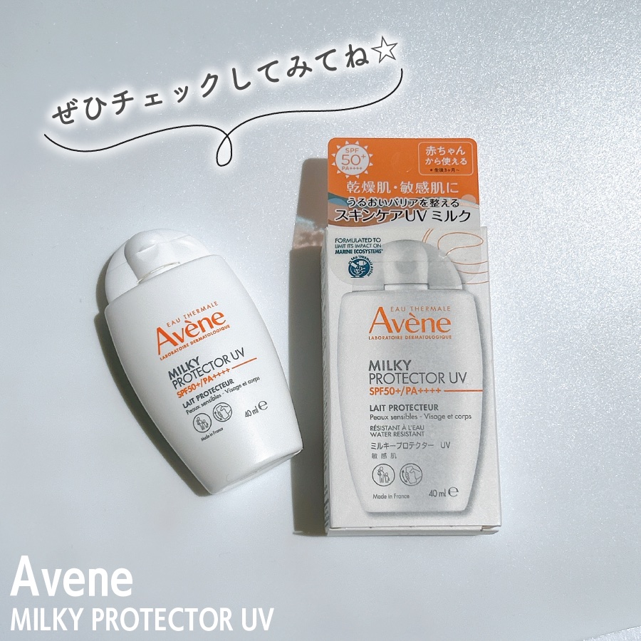 - 「守る」だけではない、うるおいバリアケアもできるスキンケア生まれのUVミルク。 ●塗布することでうるおいバリアまで整える 自然由来の保護成分(ステアロイルオキシステアリン酸イソセチル)により、 皮膚温が高まることで乱れやすくなる、肌のうるおいバリアの構造を安定化させ整えます 「守る」だけでなく、肌のうるおいバリアを整えることで、しっとりとハリのあるをキープできます ●肌に悪影響を与えるブルーライトや大気汚染から肌を守る ブルーミライト(未発酵カカオ由来成分)※1配合でブルーライトから肌を保護 アンチポリューション成分がちりや埃、PM2.5などの大気汚染から肌を守ります ●生後3ヶ月から使える 赤ちゃん(生後3ヶ月)から大人まで家族みんなで使えます ●マリンフレンドリー処方 海洋生態系への影響を最小限に抑えた処方で設計されています ●高い紫外線防効果なのに、なめらかなテクスチャー SPF50+・PA++++で日常からレジャーまで幅広く使用できます のびがよく肌に負担のない、やさしい使い心地のテクスチャーです アベンヌ温泉水配合 ウオーター&スウェットプルーフ 化粧下地としても使え、石けんで落とせる アレルギーテスト済み、ノンコメドジェニック※2 ※1 水、BG、カカオ種子エキス(整肌成分) ※2 すべての方にアレルギーや皮ふ刺激がおきない、また、ニキビができないわけではありません