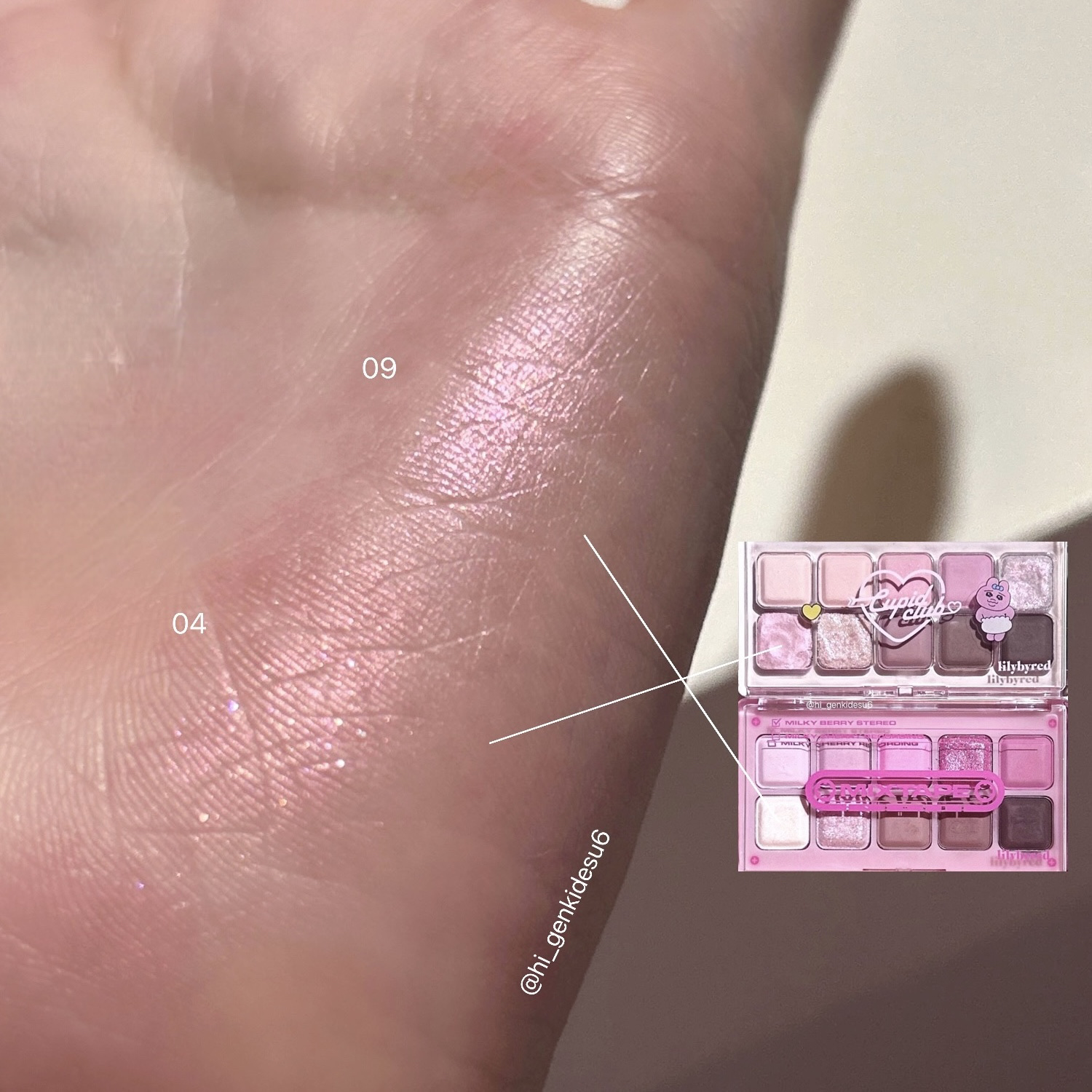 10色入りのアイシャドウパレットです。色味は青みよりの鮮やかなピンクで、青みと鮮やかさが得意なブルベの方におすすめです。 粉質はしっとりしていて密着力が高いです。ラメも密着力が高くて使いやすかったです。 全体的にピンクなのでピンクメイクをしたい時にぴったりなパレットです。