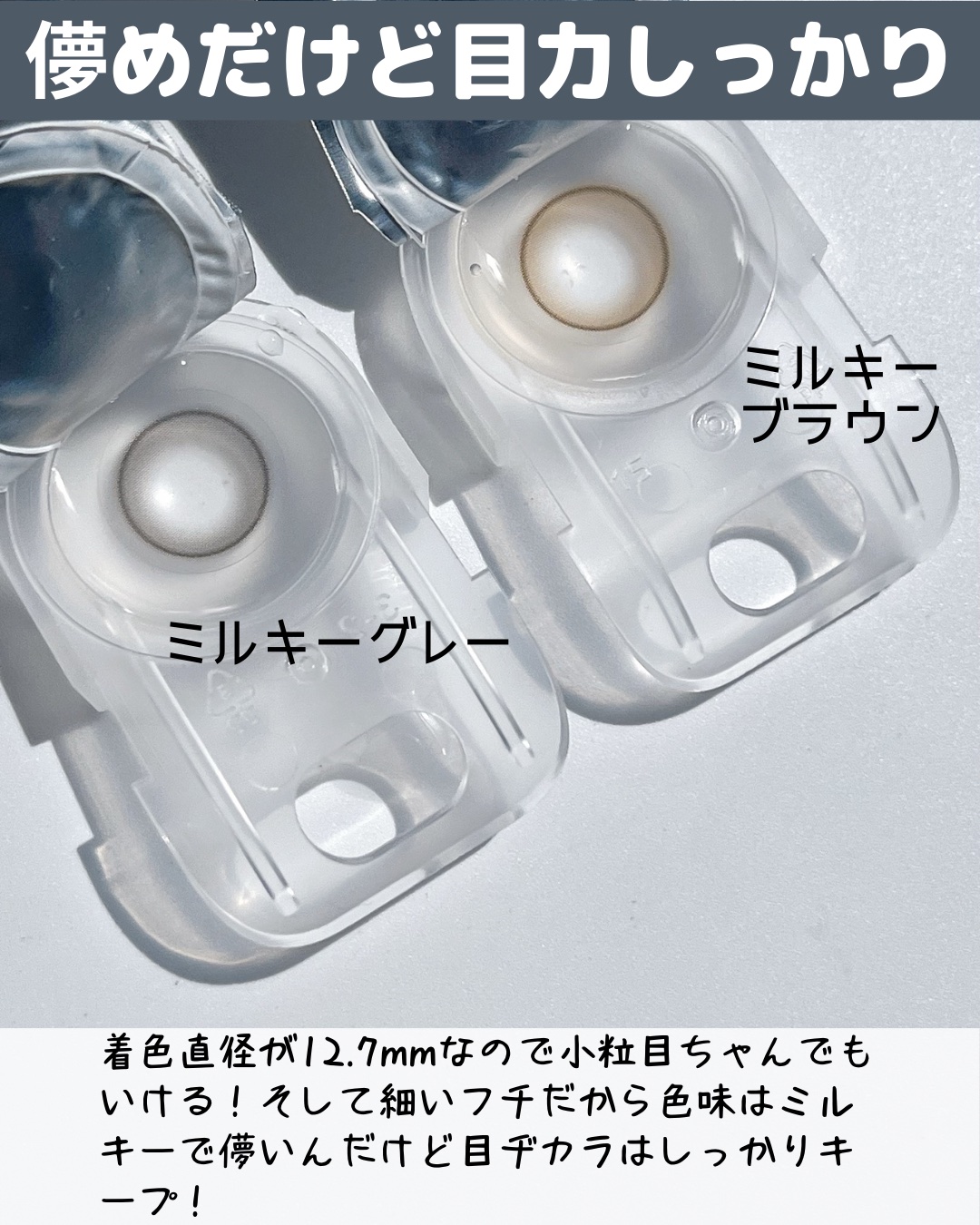 ふんわりやさしいミルキーカラー🤎 淡い色合いだけど瞳に馴染みやすくて、まるで色素薄い系な瞳に♪ フチはくっきりとした濃いめのブラウンで、瞳をくりっと見せてくれるよ! 着色直径も12.7mmと小さめサイズだから、デイリー使いにおすすめだよ😍