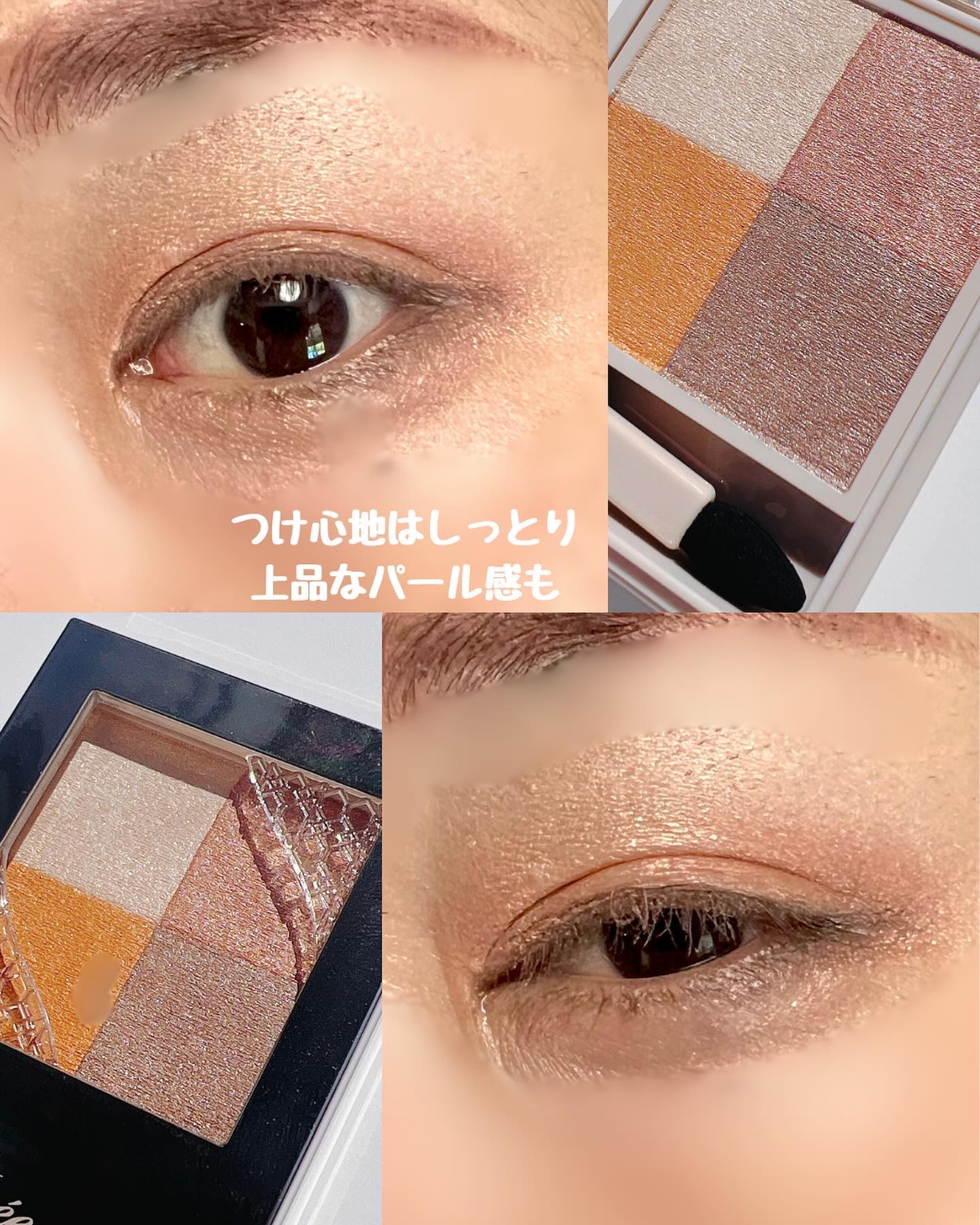 - ● しっとりほぐれるようなタッチで密着し、上品なツヤめきと透け感発色で目もとを彩る 4 色セットアイカラーです。 やさしいトーンの色味と繊細な輝きで、どこか儚げでアンニュイな印象に導きます。 ● レフ板のように光を美しく反射させるライトリフレクションパウダーを配合。 どの角度から見ても、繊細な輝きと濡れたようなツヤを演出します。 ● 透け感があり、軽いタッチでのび広がるクリアパウダーを配合。 色味を重ねても濁りのない透け感発色を叶えます。 ● とてもキメ細かなパウダーに厳選したオイルを組み合わせることで、しっとりなめらかなほぐれ感を実現。 薄膜にのび広がり、まぶたへ溶け込むように密着します。 ● スルスルとした軽い感触のオイルを配合。摩擦抵抗を減らすことで、まばたきや表情の変化によるヨレを防ぎます。 汗や皮脂にもくすみにくいため、時間が経ってもつけたての美しい発色が持続します。 ● まぶたに明るさをあたえ、後から重ねるアイカラーを美しく発色させる「スキンブライトカラー」(A)をセット。 光を味方につけてまぶたのくすみを飛ばし、明るくツヤめく目もとを叶えます。 ● 色ごとに仕切りがないため、1 色ずつはもちろん、パレット内で色を混ぜて塗布することもできます。 ● 美容液成分配合。乾燥しやすい目もとのうるおいをまもります。 ● 無香料