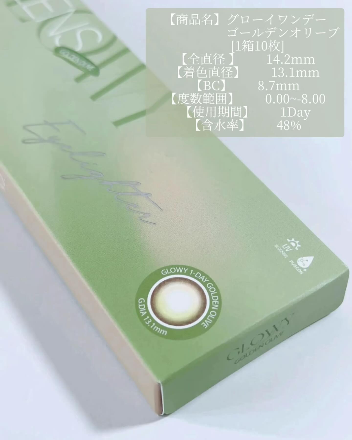 - 韓国カラコン業界の話題のブランド『OLENS(オーレンズ)』の日本正式承認商品シリーズ。世界中から注目を浴びるグループ「NewJeans (ニュージーンズ)」がイメージモデル。 日本でも定番のシリーズ『Glowy』から、瞳にツヤ感を与えるオリーブカラーが登場。 ほんのりで繊細なハイライターカラーで、立体的に輝く瞳を演出する瞳にツヤを出す水光レンズ。ソフトなカラーで優しいちゅるんとした瞳に。 瞳になじむ黄金色のグラデーションが、まるで内側から輝くような立体的な瞳を演出します。 ■使い方 コンタクトレンズは高度管理医療機器です。必ず眼科医の処方に従って購入してください。 ■使用上の留意事項 コンタクトレンズは高度管理医療機器です。眼科医の指導に従い装用期間を厳守し、正しくお使いください。眼の定期検査を必ず受けてください。添付文書を必ず読み、取扱方法、装用時間を守って正しくお使いください。少しでも異常を感じたら、直ちに眼科医の検査を受けてください。