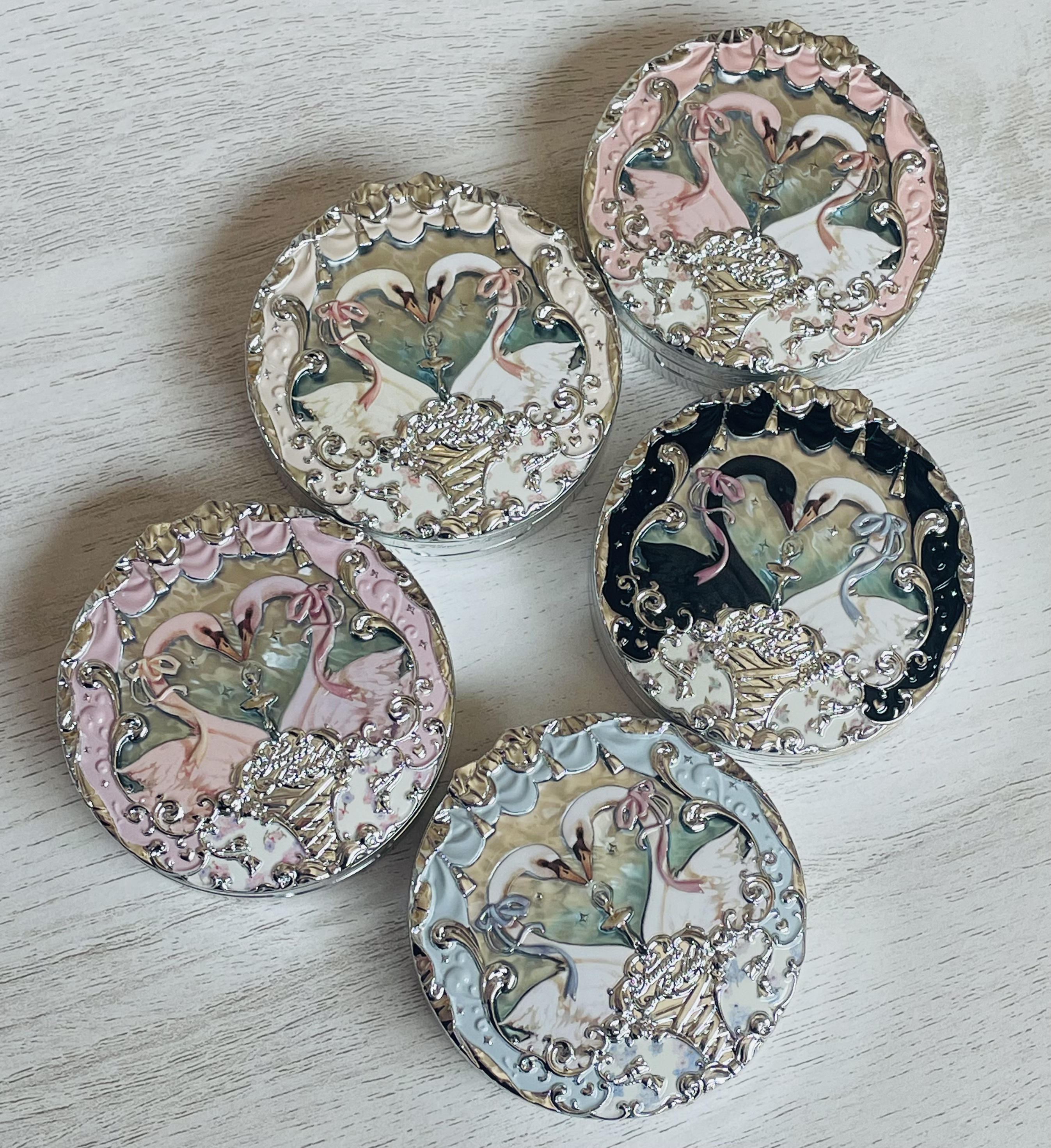 白鳥の刻印が可愛すぎて✨ 使ってるうちになくなっちゃうんですが、気分は上がる↑↑ 粉質はしっとりしていて、 見た目はっきりしたカラーですが、つける前にブラシの余分な粉落としてからつけたら濃すぎないしふんわり仕上がります💕 何より他に類を見ないパケのかわいさがあるので気になる方はぜひ!!