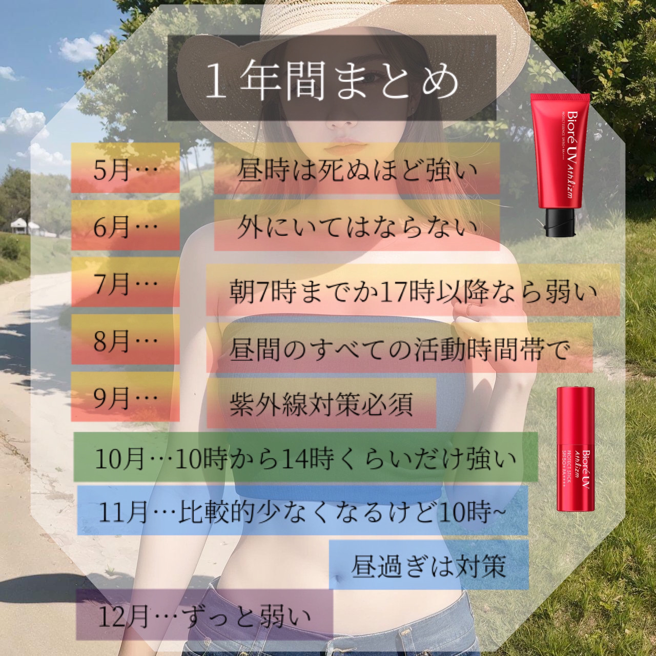 夏に入っていく4月、5月から9月、10月までは油断せずに気合いの入った日焼け対策が必須📝 朝方、夕方ごろだってちゃんと紫外線が降り注いでいることを忘れないように外出します🏃 ※住む地域や観測時期によって紫外線量が変わってくる場合があるので公式の情報を確認してください